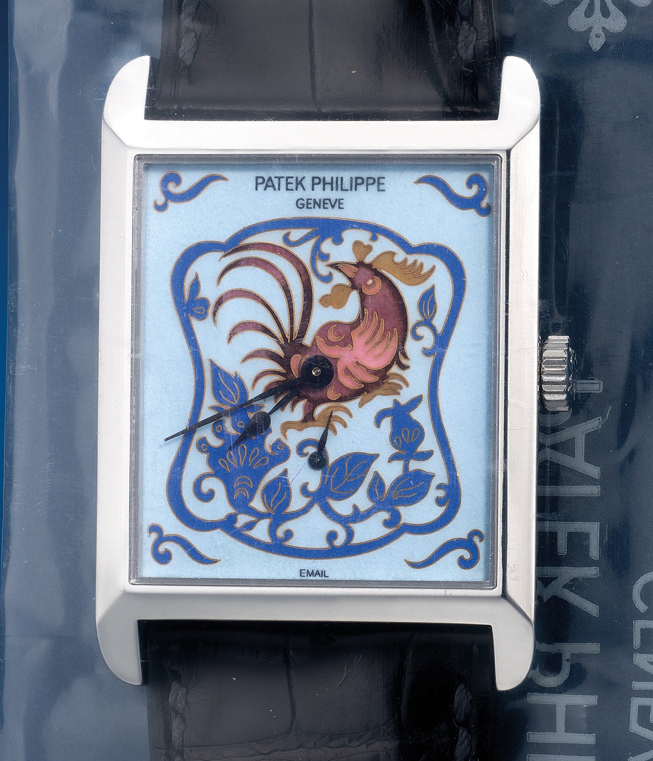 A very rare, “like-new” and attractive platinum rectangular-shaped wristwatch with baby blue “Rooster” cloisonné enamel dial, Certificate of Origin and presentation box