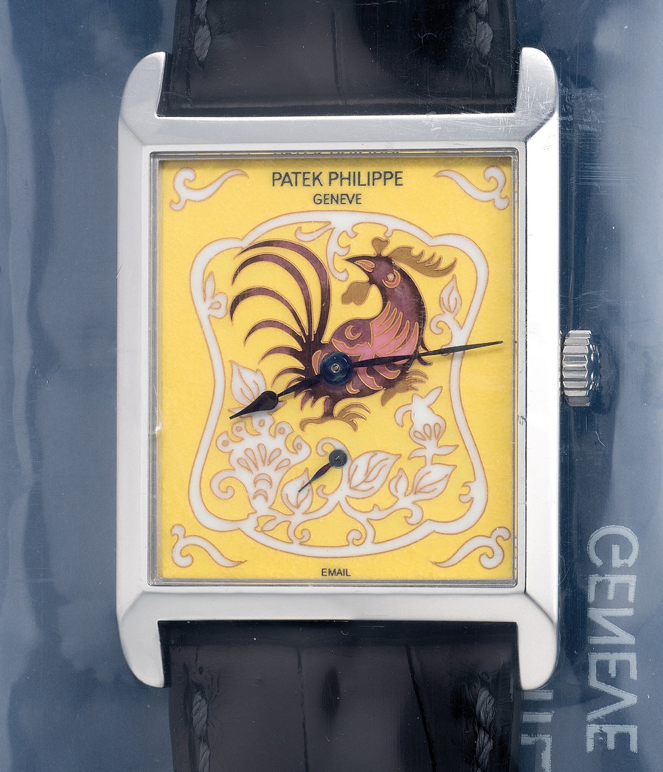 A very rare, “like-new” and attractive platinum rectangular-shaped wristwatch with yellow “Rooster” cloisonné enamel dial, Certificate of Origin and presentation box