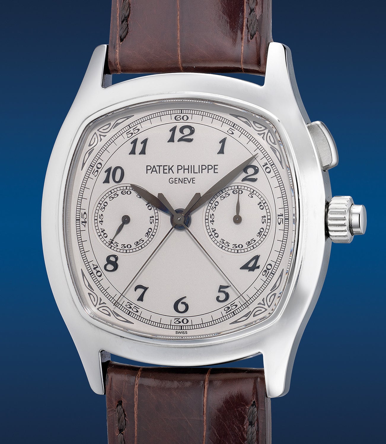 At Baselworld in 2010, Patek Philippe announced the reference 5950, a cushion-form, single button split-seconds chronograph with the same in-house movement but boasting subtle Belle Epoque styling. Patek Philippe launched the reference with a larger case made of stainless steel – an unusual and most appreciated decision since the vast majority of Patek Philippe’s complicated timepieces are housed in cases made of precious metals. An “application piece” reserved for the brand’s best clients, the steel reference 5950 further impressed collectors with its raised, applied black gold Breguet numerals, black lacquer scroll detailing at the corners and on the buckle, and its lustrous opaline dial. The direct inspiration for the reference 5950 can be found in the archives of the Patek Philippe Museum, with a similar single-button split-seconds chronograph cased in 18K yellow gold and bearing similar scroll details on the dial.
