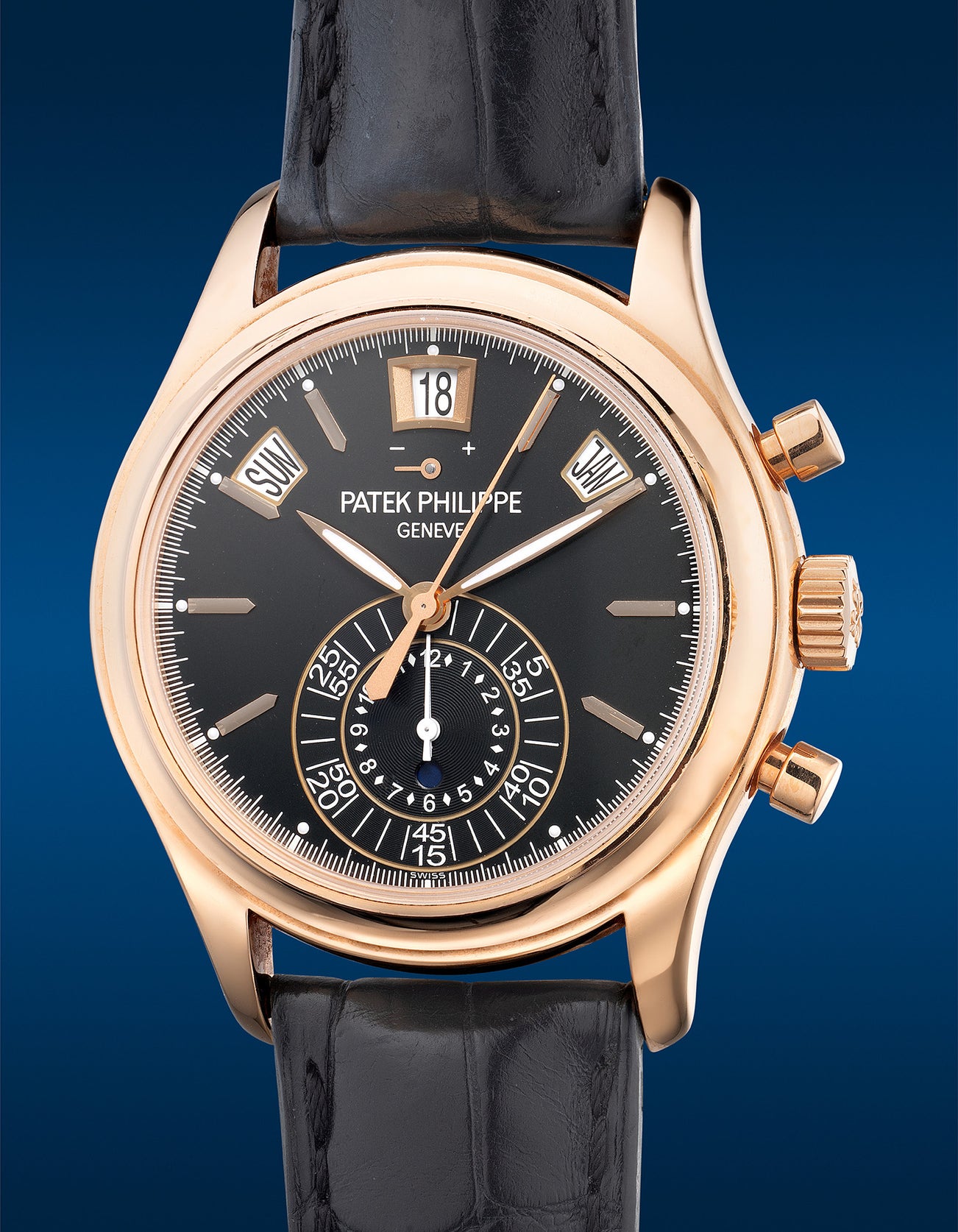 A very fine and rare pink gold annual calendar chronograph wristwatch with power reserve, day and night indication and presentation box