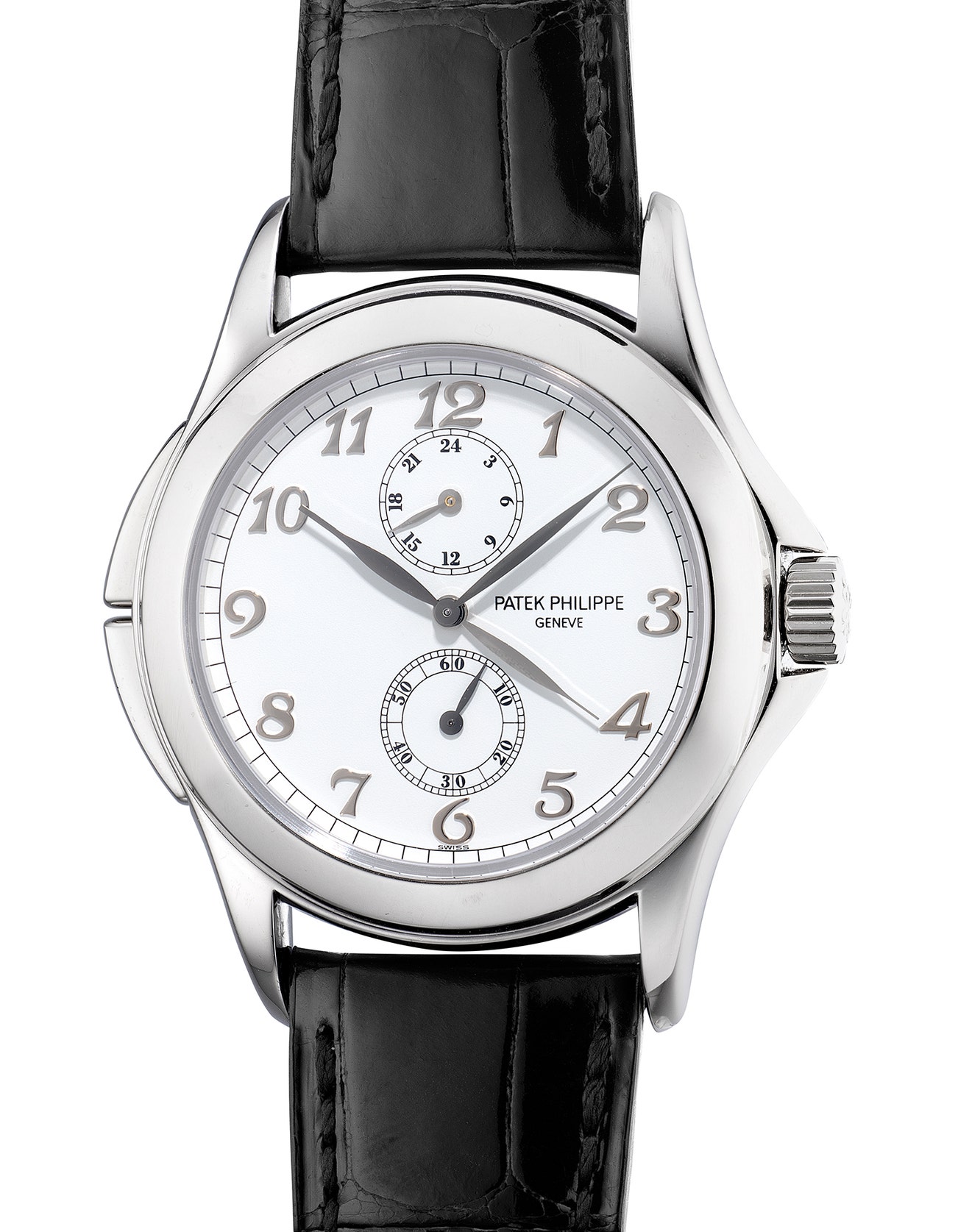 The combination of its traditional design, contemporary mechanisms and majestic white gold case results in a modern heirloom made to be passed on for generations. Last produced in 2008, this rare discontinued dual-time Patek Philippe is presented in excellent condition with its fitted presentation box.
