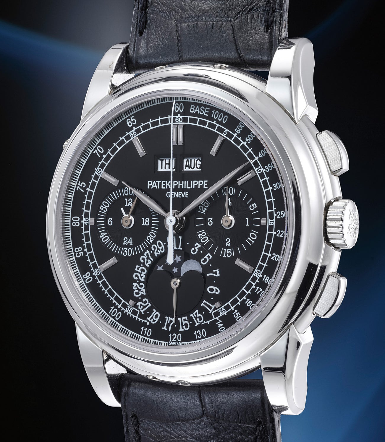A highly rare and attractive platinum perpetual calendar chronograph wristwatch with moonphases, 24-hour indication, leap year indication, certificate of origin, additional caseback, hang tag, setting pin and presentation box