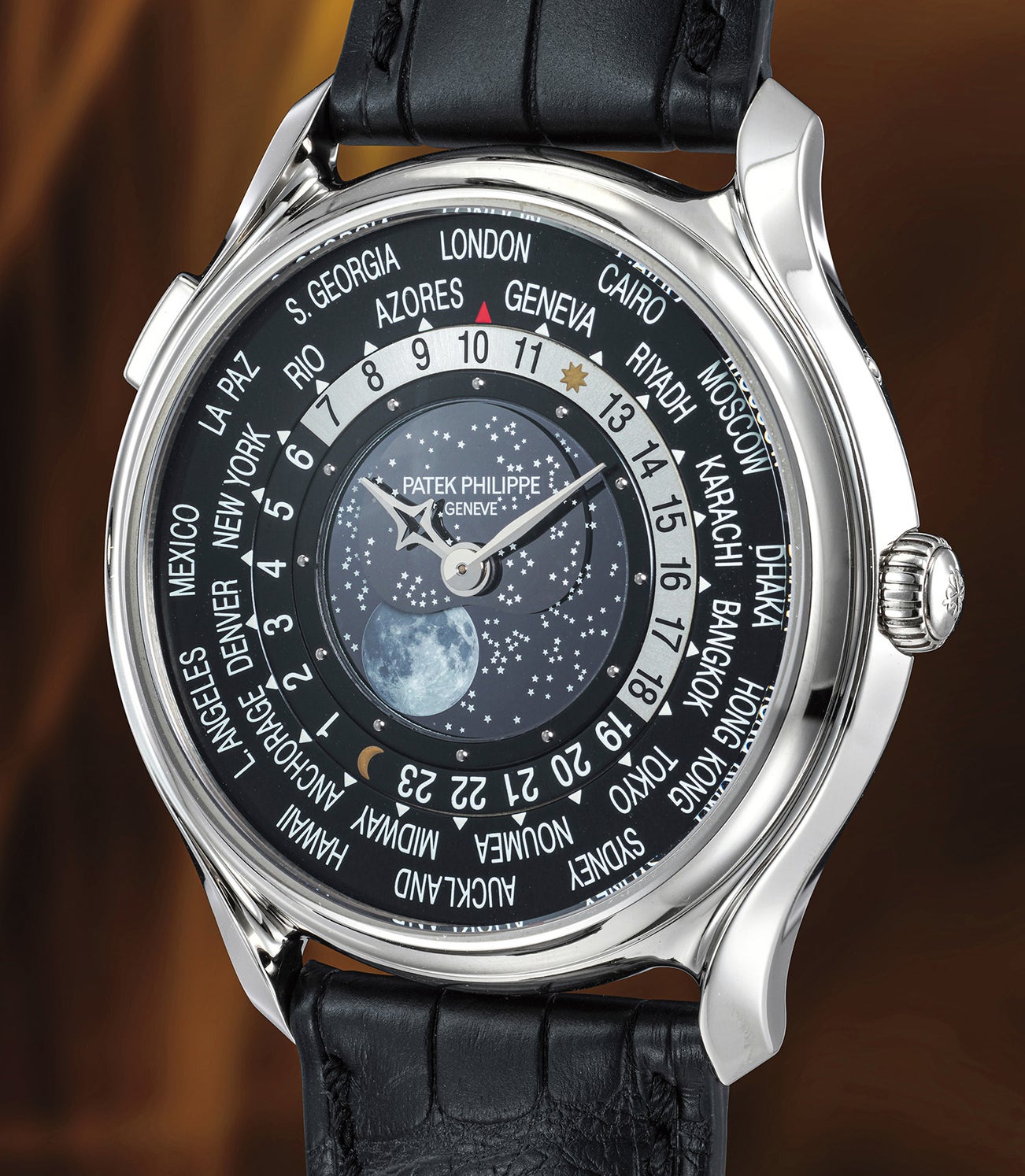 The reference 5575 is a classic World Time model enhanced with a moon phase complication. Two thin discs can be found on the dial side, allowing the wearer to see a starry night with the waxing and waning of the moon. As an aesthetic change, the Central European time zone, normally indicated by Paris, was changed to Geneva to honour of Patek Philippe's home city. Eye-catching and enigmatic, the model was produced in a limited edition of 1300 pieces as a tribute to one of the brands most iconic complications, the World Time wristwatch.