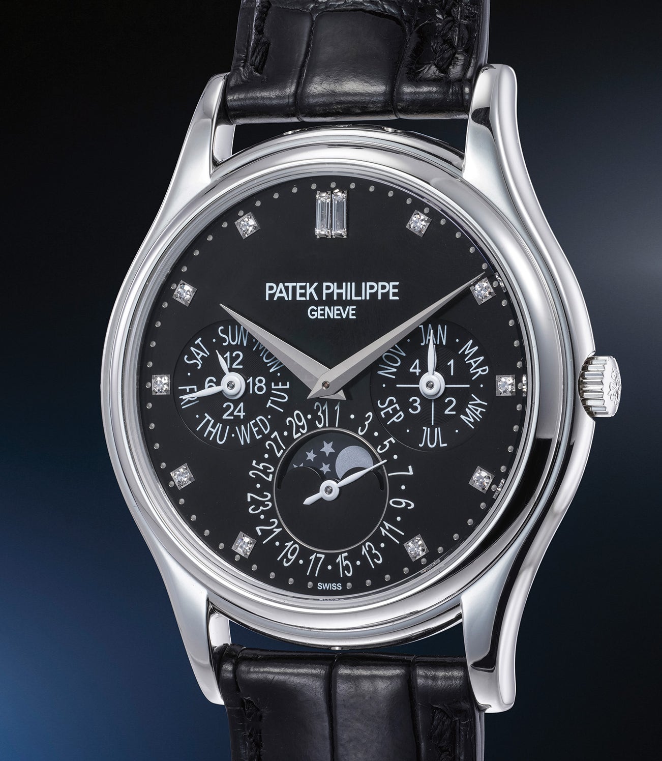 A very fine and rare platinum perpetual calendar wristwatch with black dial, diamond-set indexes, moon phases, 24-hour, leap year indication, certificate of origin and presentation box