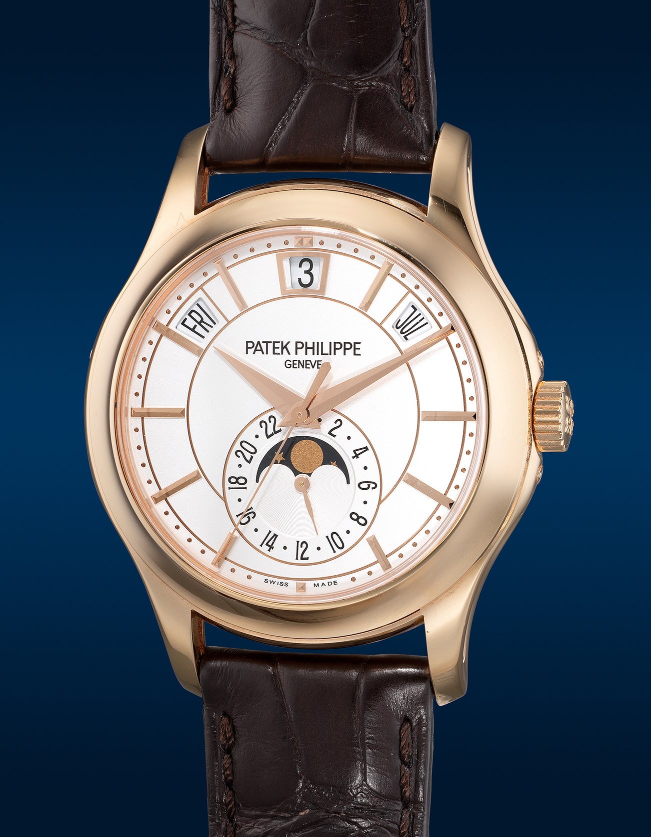 - Boasting distinct Patek Philippe proportions, the Annual Calendar ref. 5205 was first introduced in white gold only at the turn of 2010. This mechanical marvel became an instant hit with its patented instantaneous digital date display of day, date and month, which resembles the highly important ref. 5207, Patek Philippe’s exclusive minute repeating perpetual calendar tourbillon wristwatch. All date indications on the upper quadrant of the dial advance immediately at the stroke of midnight, unlike its predecessors, where each indicator would slowly advance over the course of several hours. Thanks to its soaring popularity, the manufacturer announced the release of the pink gold variants in 2013, fitted with a black or opaline dial.