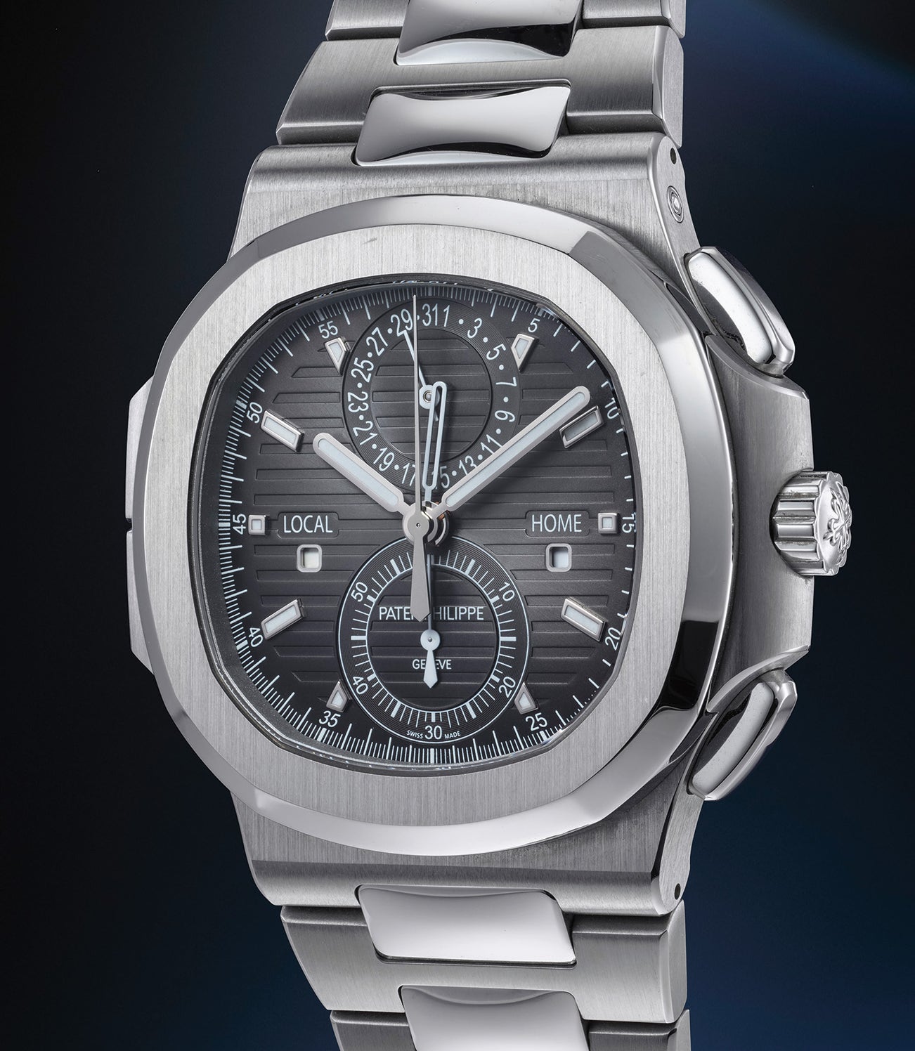 Known as the Nautilus Travel Time Chronograph, reference 5990 features a bevy of complications. The watch displays two time zones, as well as the date in addition to the flyback chronograph complication. There are furthermore "Home" and "Local" day/night indicators at 3 and 9 o’clock.