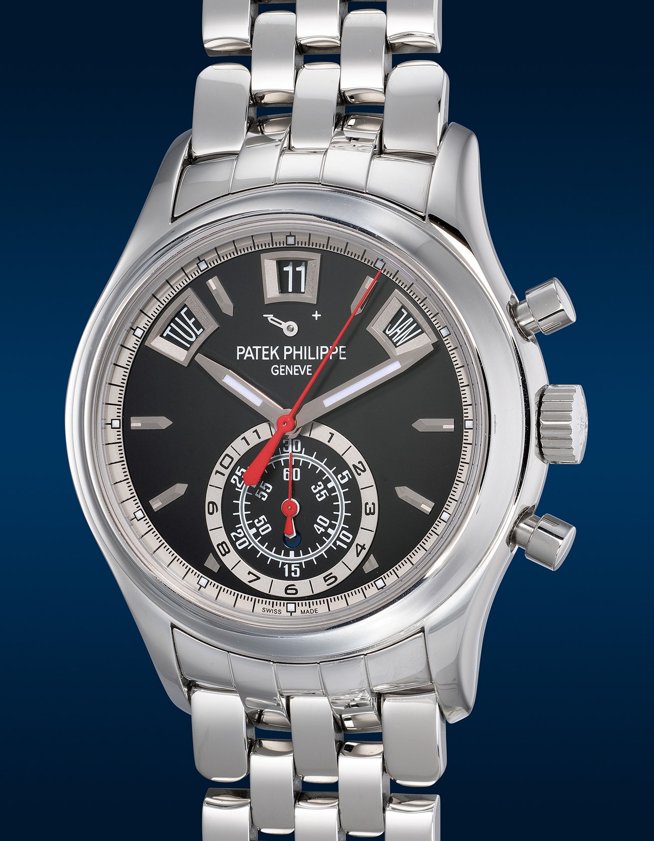 A very fine and rare stainless steel annual calendar flyback chronograph wristwatch with power reserve, AM/PM indication, bracelet, Certificate of Origin and presentation box