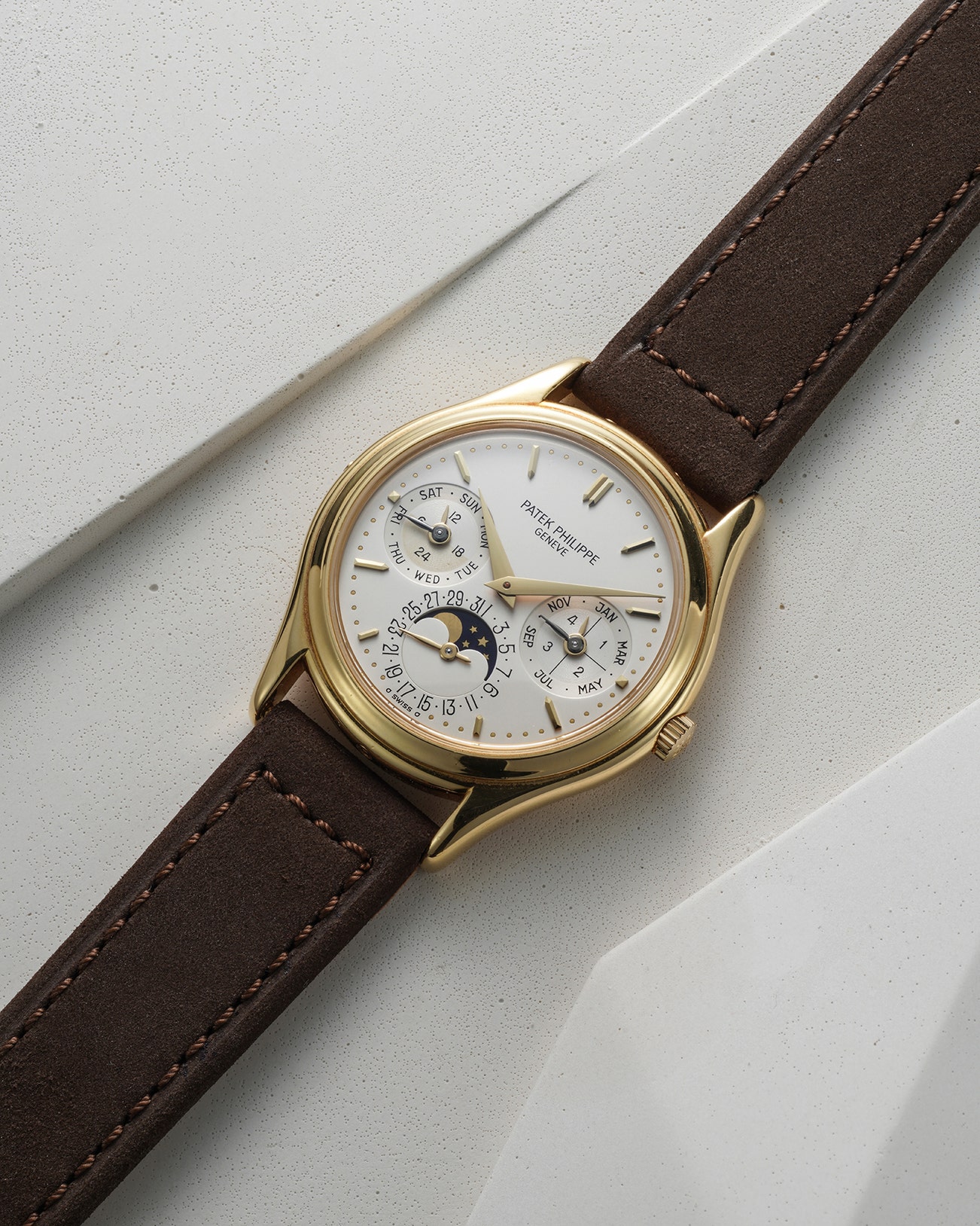 - Encased in a lovely yellow gold case, the present reference 3970, retaining a sigma dial and bearing a case serial of 2'884’XXX and movement number 772'XXX, belongs to the second series, featuring a cross hair leap year indication, sunken subdials and two tone 24h indicator
