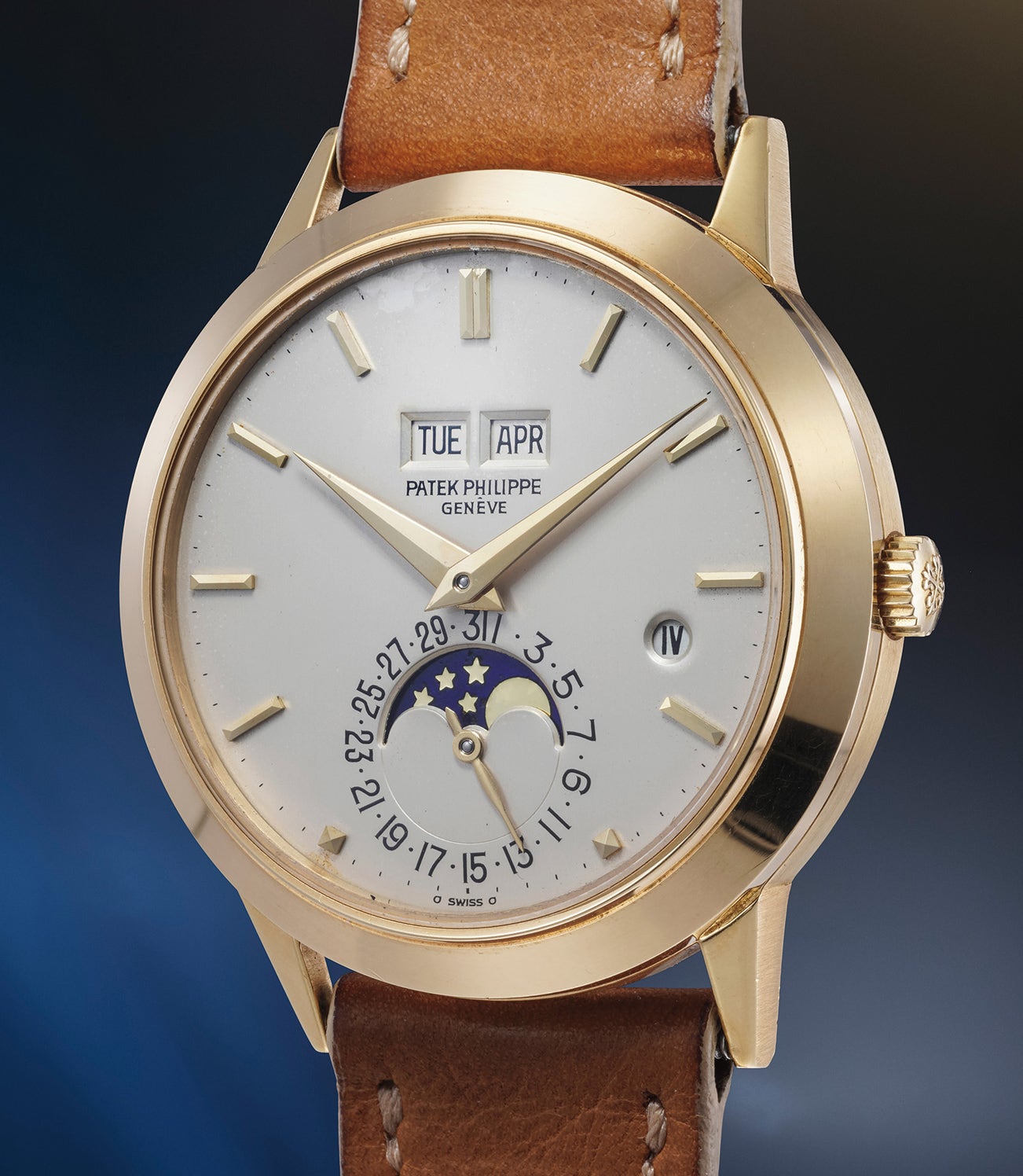 Technically, the model represents one of the unchallenged pinnacles of watchmaking. It is powered by cal. 27-460Q, the perpetual (Q: Quantième) upgrade of calibre 27-460 which is considered one of the best - if not the best - automatic movement of all times. It represents the final (and surprisingly not so well known) evolution of the famous cal. 12-600, the first Patek Philippe automatic movement. As Rolex held the patent for the automatic rotor, Patek Philippe patiently waited for its expiration and in the meanwhile put their R&D department to work, for decades, on an automatic movement. The resulting cal. 12-600 was already superb, but Patek Philippe strove to make it even better. When the company deemed to have gotten as close to perfection as possible, they renamed cal. 12-600 as cal. 27-460. Thus, this is the most complex (perpetual calendar) variation of the final evolution of what is considered the most advanced vintage automatic movement. Also due to its short run (1981 - 1985) Patek Philippe produced very limited quantities of reference 3450, typically casing the model in yellow gold. To date, scholars estimate that Patek Philippe produced only 237 examples in total, making it one of the rarest Patek Philippe perpetual calendar models ever produced in series.