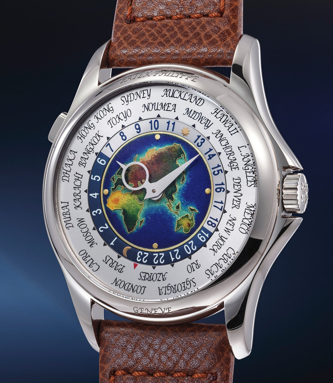 The white gold case of present example in a perfect frame for the vibrant cloisonné enamel center dial depicting Europe, Africa and Asia in a wonderful array of blues, greens and yellows all outlined in fine gold.