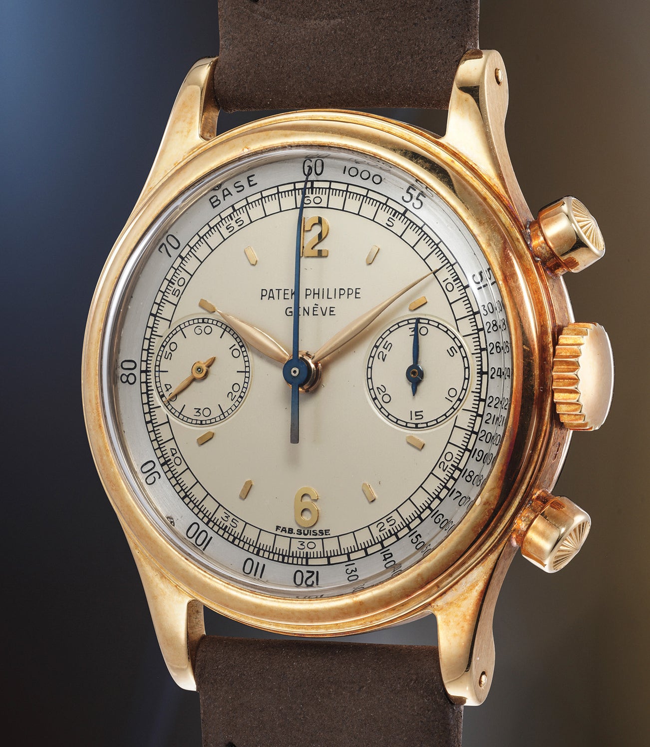 The two tone dial is preserved in superb condition with strong contrast between the outer silver section and the cream colored centre. It also features incredibly strong enamel graphics, with the "accent" strong and apparent above the Patek Philippe Genève signature. There are no losses to the enamel, attesting to the completely untouched condition of the dial.