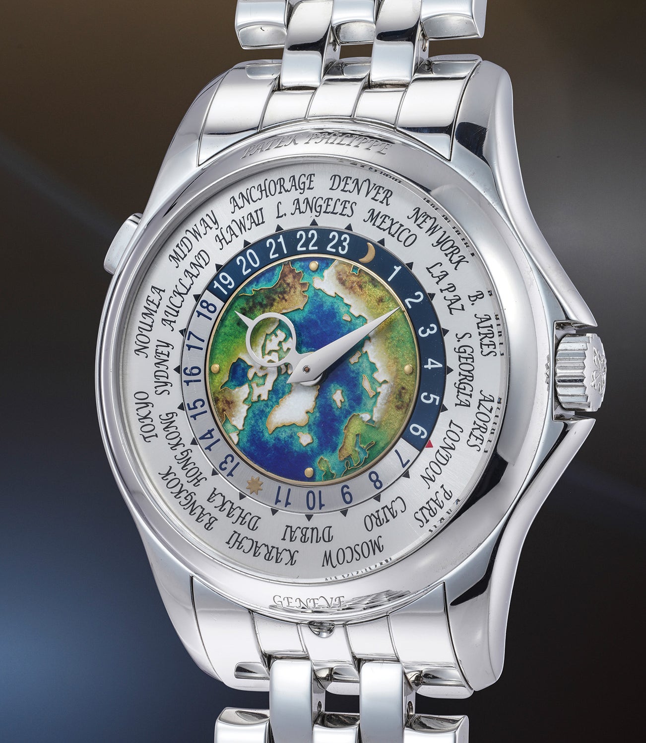 An exceptional and very well-preserved platinum world time wristwatch with bracelet, cloisonné enamel dial depicting the North Pole, certificate of origin, and presentation box