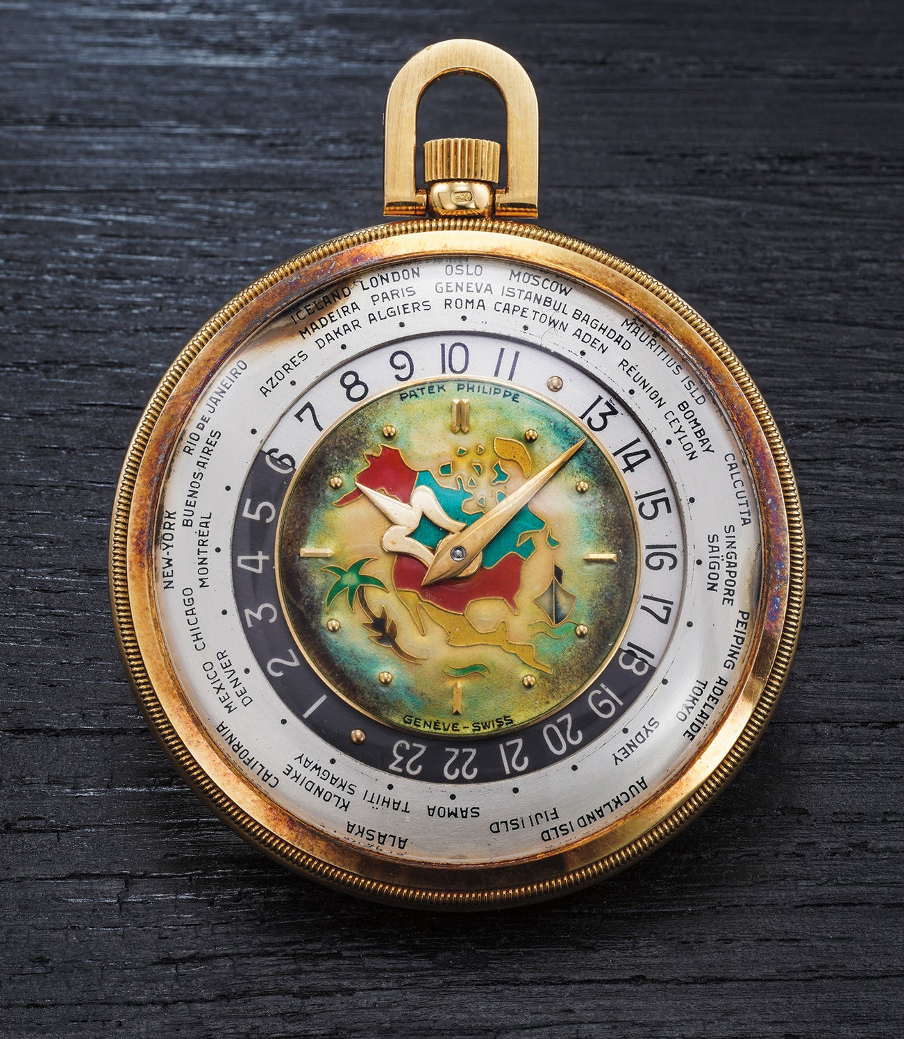 Production of reference 605HU - for Heures Universelles (universal hours in French) - commenced in 1937, continuing up to the late 1960s. These models were available either with metal dials or, in some rare instances, cloisonné enamel dials representing maps (a leitmotif of PP World Time watches, found on wrist versions as well, both vintage and modern) or other themes, and the production of every single piece was made under the supervision of the inventor of the World Time system, Louis Cottier - who also handmade the hands of the watches, to ensure perfect functionality and lack of friction with the dials. In fact, the “LC” monogram of the watchmaker is present - together with the watch movement number - on the back of the enamel disc. As far as we know, these Cottier signatures are the only example of a watchmaker’s signature on Patek Philippe timepieces, which highlights in how high a regard Mr. Cottier was held by the company.