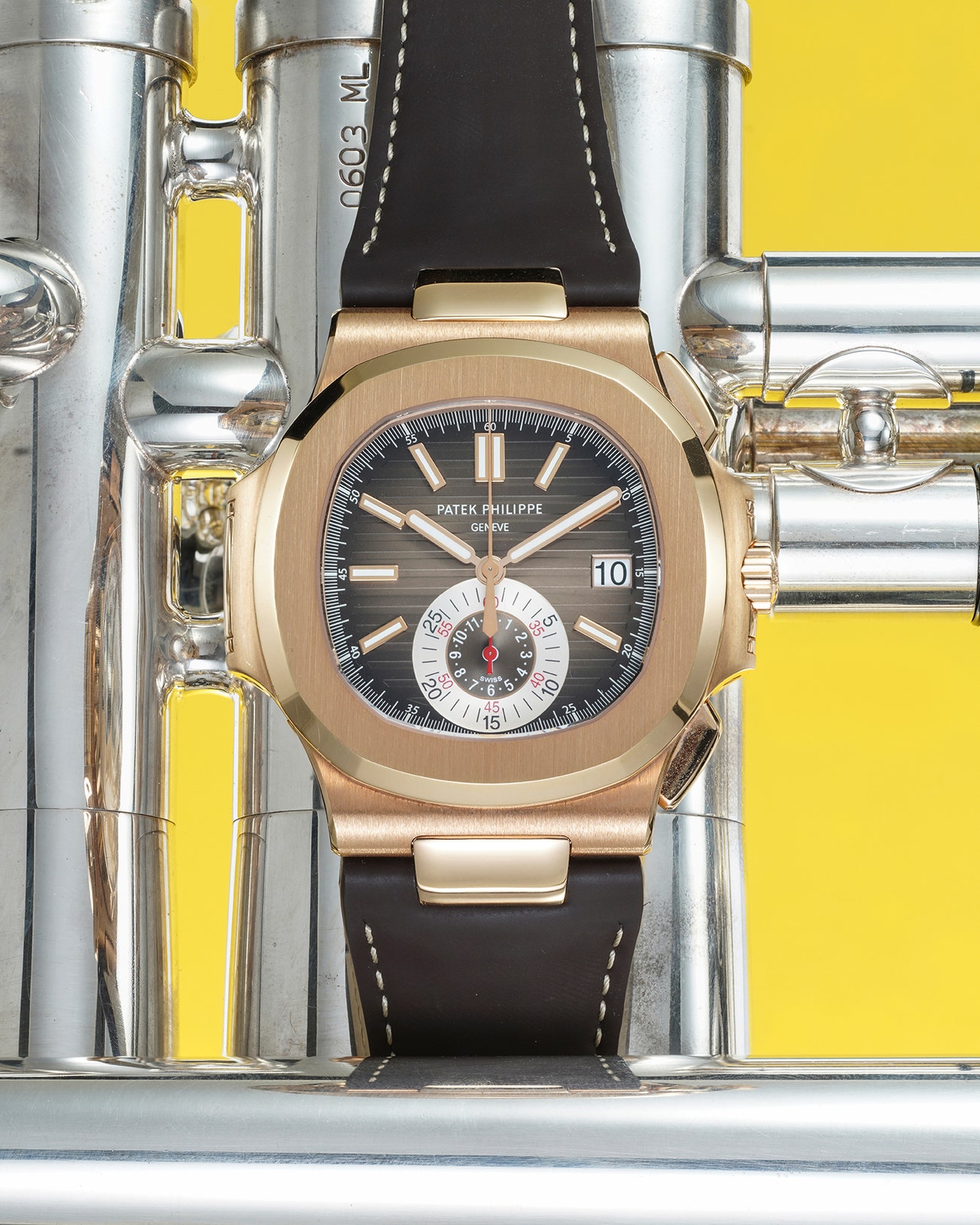 - Originally released in 2010, the timepiece was fitted with an attractive chocolate brown dial matching perfectly the 18K pink gold case. The dial also features a silvered all-in-one register at 6 O’clock. Powered by Patek Philippe’s in-house self-winding chronograph ref. CH 28-520 C, the calibre of this reference is greatly admired by the watch community.