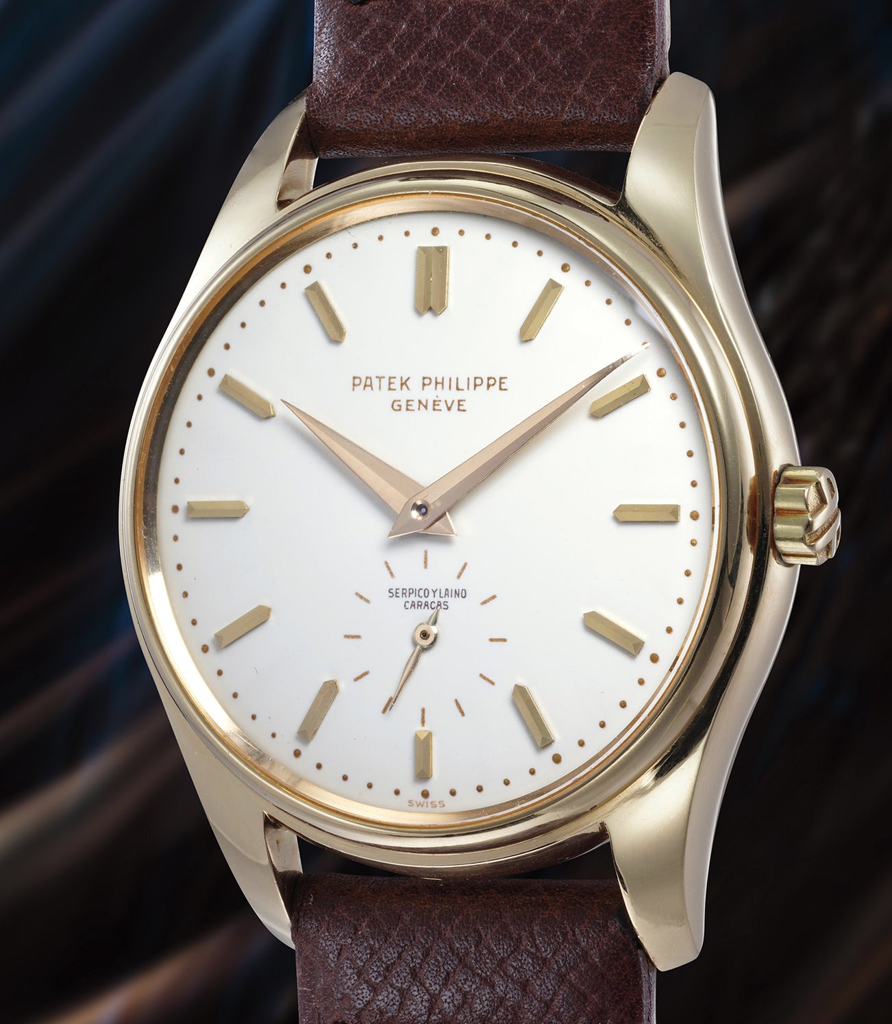 The present example is an exceedingly rare yellow gold example retailed by Serpico y Laino. Founded in the late 1920s by Leopoldo Serpico and Vicente Laino, Serpico y Laino is no longer in business today but has had the privilege of stamping its name on some of the most important Patek Philippe and Rolex timepieces of the 20th century. This watch has been preserved in exceptional condition, and the case is preserved in possibly unpolished condition. The pristine second generation enamel dial displays the exclusive Serpico y Laino retailer signature in the subsidiary dial for constant seconds. Additionally, the caseback stamped ‘S.&L.’ remains crisp and legible, which is a treat for collectors to see. In addition, a crisp hallmark can be found between the lugs, underscoring the exceptional condition of this timepiece. Given the thick proportions and defined angles, we believe that the watch has never seen polishing throughout its lifetime.