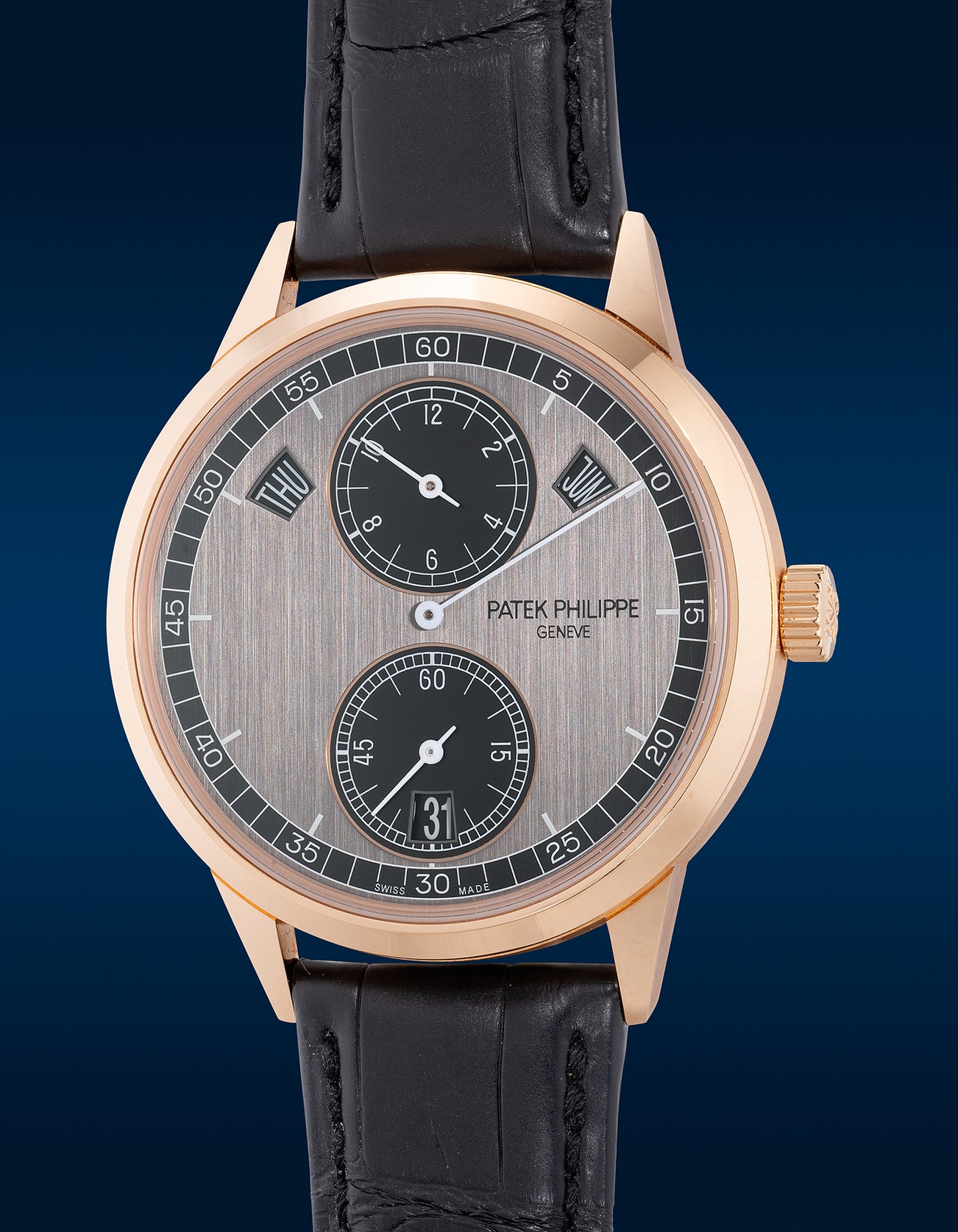 A fine and attractive pink gold annual calendar wristwatch with small seconds, two-tone regulator dial, Certificate of Origin and presentation box