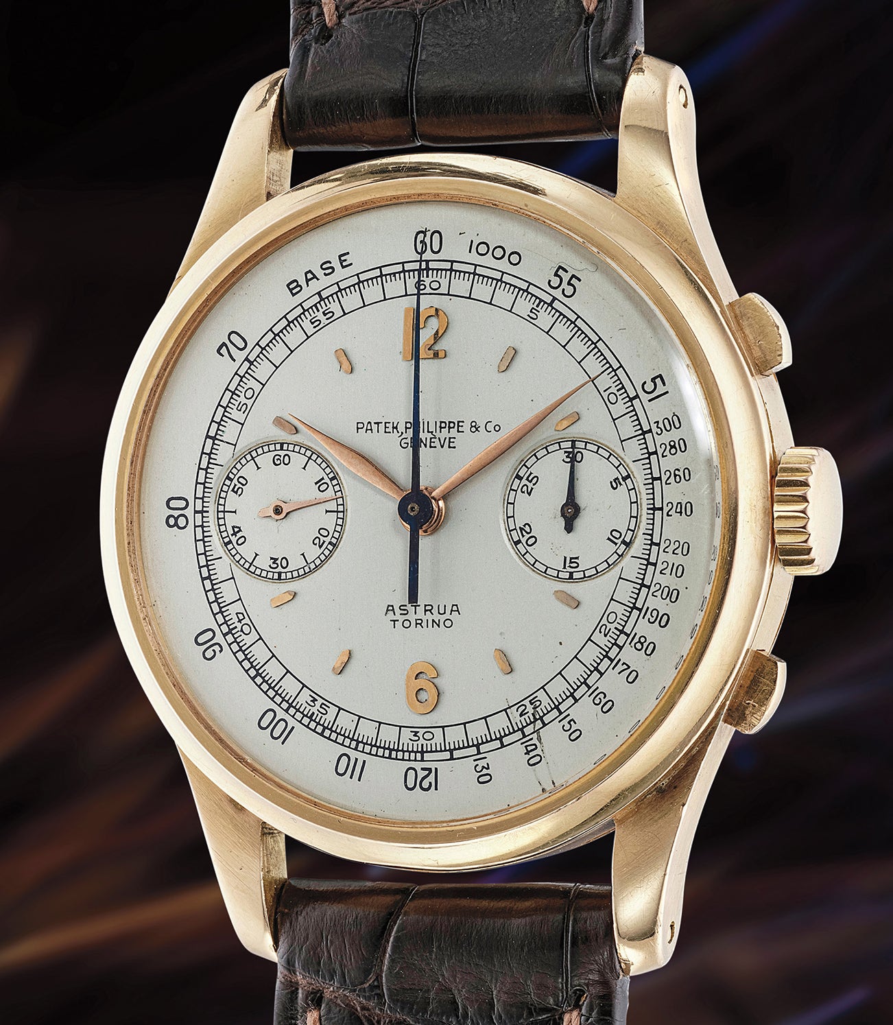 Launched in 1937, Patek Philippe’s reference 530 remains one of the rarest and largest vintage chronograph models manufactured by the firm, its large 36.5mm diameter being as relevant today as it was 80 years ago. Nevertheless, three elements, featured in the present chronograph, add even greater desirability to this grail watch: a perfectly preserved pink gold case, an ivory dial, and the prestigious Astrua Torino signature.