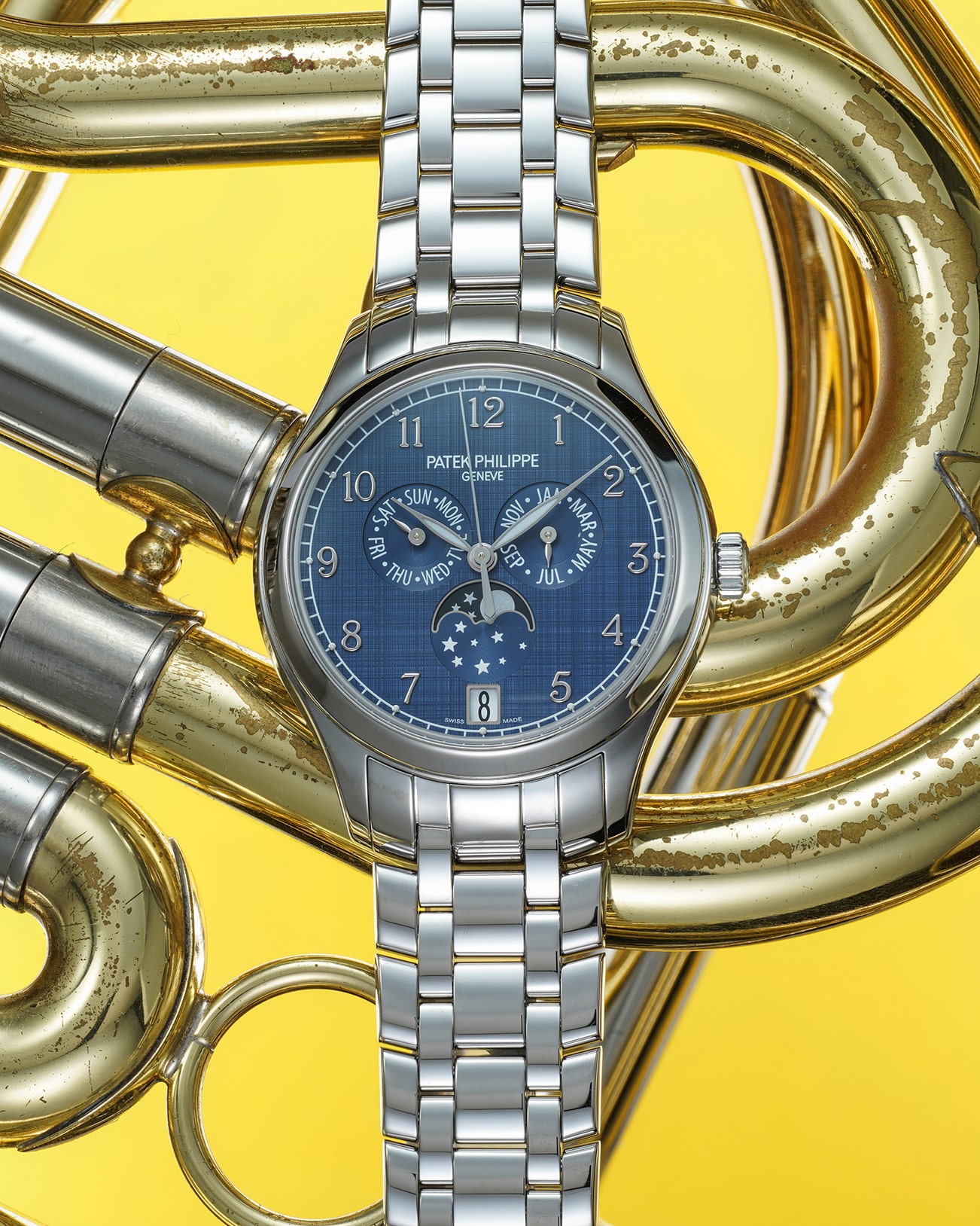 -Cased in stainless steel at 38mm in diameter, the timepiece is further paired with a matching five-row bracelet. The denim-esque blue dial features a stunning “shantung finish”, a type of silk plain weave fabric finish that showcases both horizontal and vertical patterns. The dial showcases three sunken subdials indicating the day, month, and moon phase, at 6 o'clock a date aperture is present.
