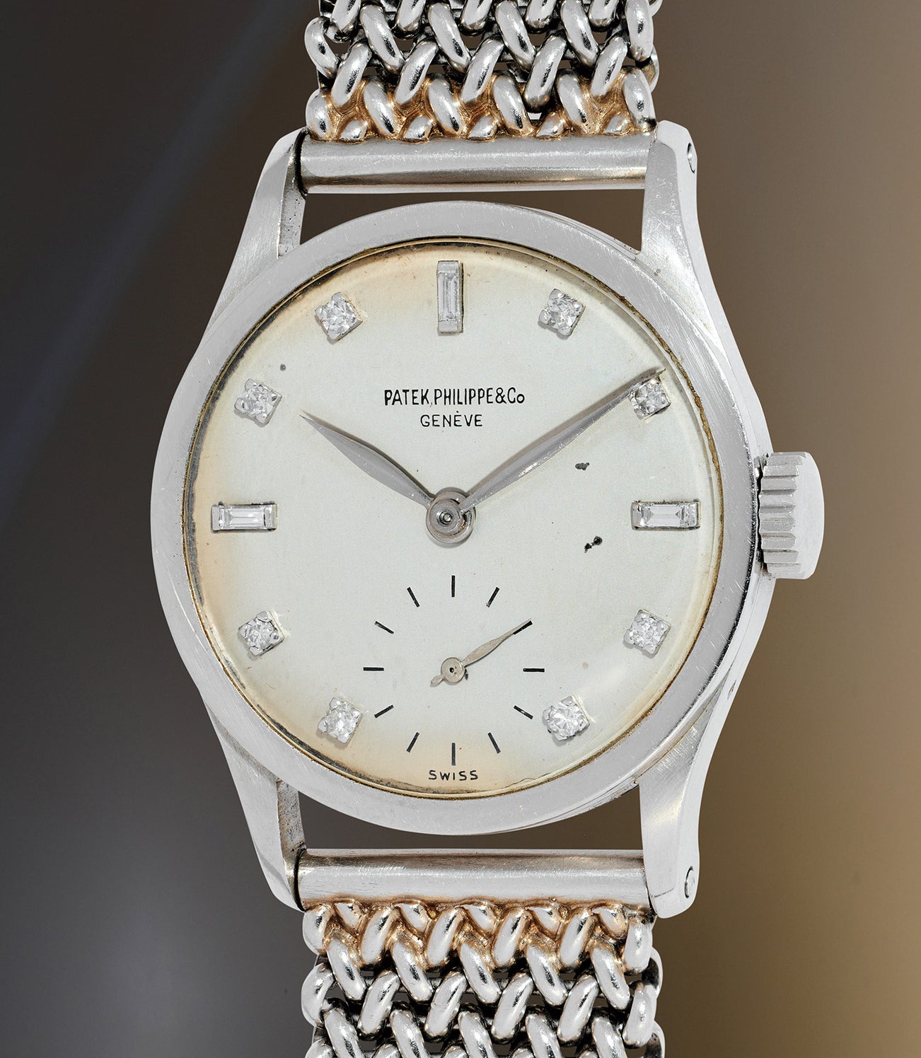 This classic 96 is offered at auction for the first time by the family of the original owner. A long time collector and watch enthusiast, the owner’s collection included many important and lovely timepieces. His appreciation for Patek Philippe included several custom-made wristwatches, which are still cherished by the family today. This lovely example is preserved in wonderful original condition. The watch showcases crisp lugs and full proportions with the platinum marks on the case crisp and visible even without the aid of a loupe. The case back inscription is crisp, while the dial is well-preserved with the long “Patek Philippe & Co.” signature found on pre-1948 wristwatches. The watch is accompanied by a later unsigned platinum bracelet that adds an extra layer of luxury, perfectly complementing the diamond-set dial.