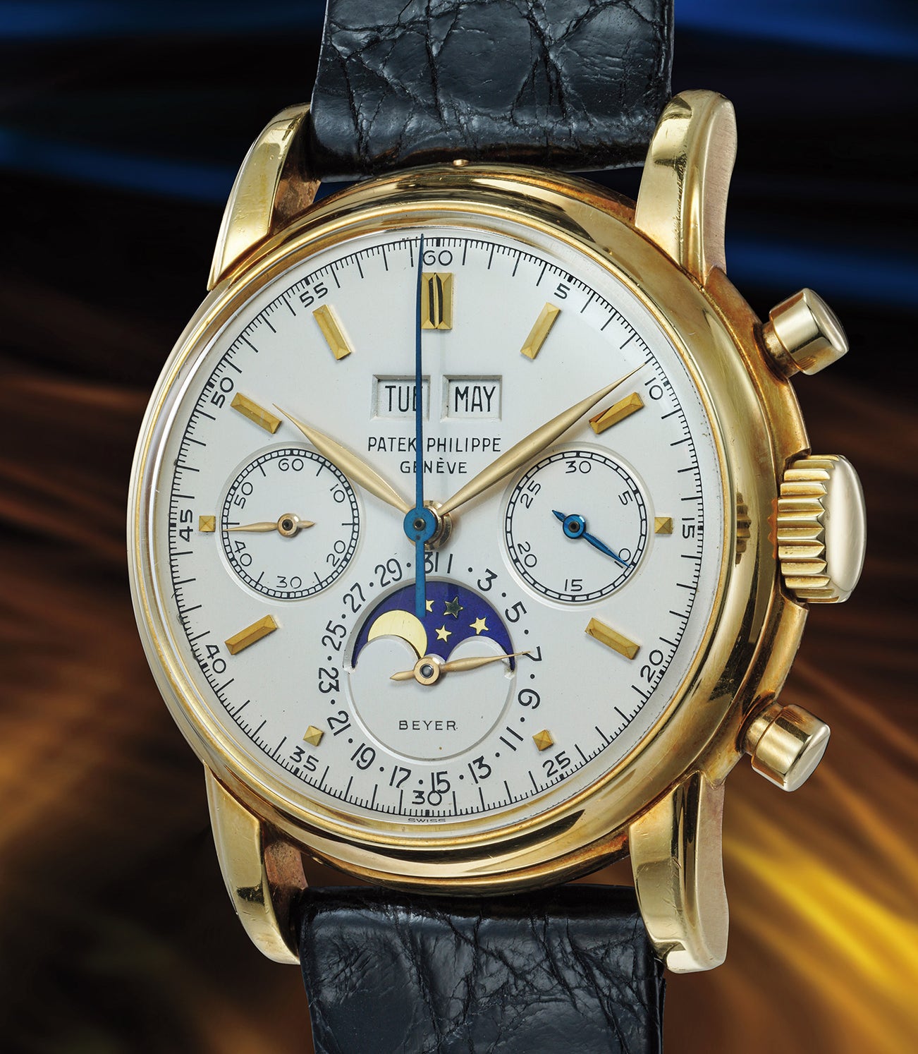 A supremely rare, well-preserved and highly important yellow gold perpetual calendar chronograph wristwatch with moonphases, retailed by Beyer