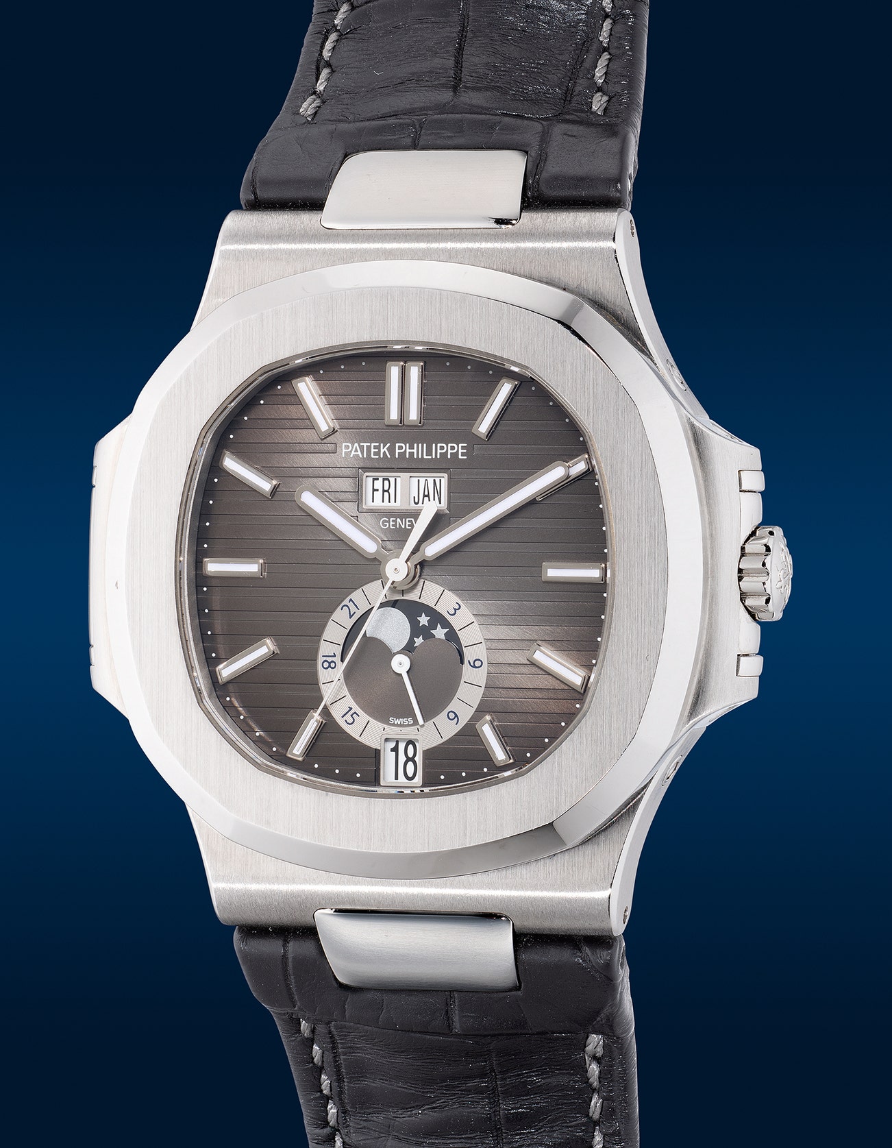 - Encased in stainless steel, the ribbed grey dial is balanced with understated displays of the annual calendar and 24-hour indicator, belying the complexity within. Paired with a crocodile strap, this Nautilus reference attained a perfect harmony of sporty and chic.