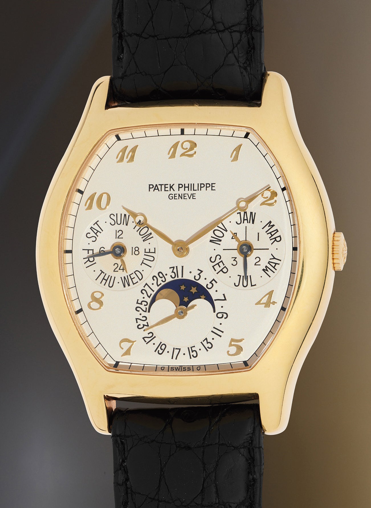 An early and attractive yellow gold perpetual calendar wristwatch with Breguet numerals, moon phase, 24-hour indication, Certificate of Origin, additional hard caseback, and presentation box