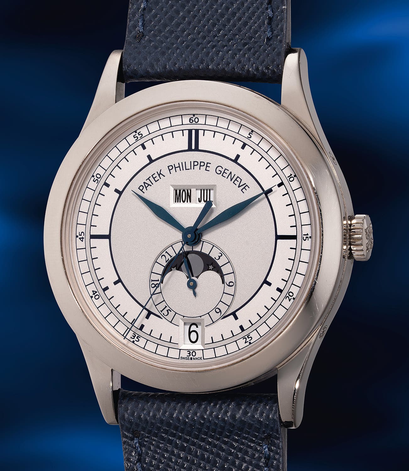 In 2006, the firm launched the vintage-inspired two-tone sector dial ref. 5396 in pink gold, followed by white gold version like the present example in 2008. Inside housed a calibre that features a Spiromax balance spring and a Gyromax balance-wheel. The monochromatic contrast of the silvered tone dial framed by the navy blue sector markings displays exquisite design proportions. The collection continues its brilliance by offering different displays and nuances of style, two years after its release, the reference took on a classic approach with applied indexes much like the ref. 3448. Preserved in excellent condition, this is a perfect opportunity to own an early and fresh-to-the-market example of a modern classic.