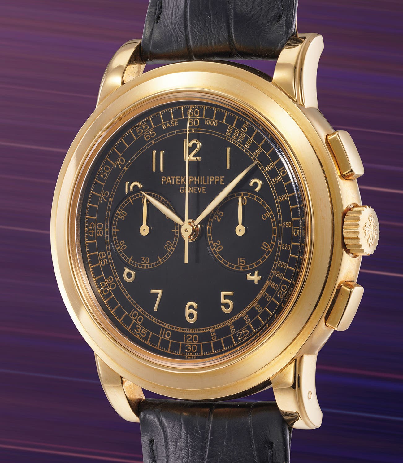 A worthy and highly anticipated successor to the classic reference 1463 chronograph, which was removed from production in the 1960s, when released in 1998 the 5070 also featured a water-resistant case with a screw-down case back. First released in 18K yellow gold with a black dial, like the present example, the manufacture drew inspiration for the design of the 5070 from a unique, split-seconds chronograph wristwatch from the early 1950s: the extraordinary reference 2512, which measured at an incredible 46.2mm in diameter with influences from the Art Deco period and large aviator’s watches. The reference 2512 is currently housed in the Patek Philippe Museum in Geneva. Later produced in white gold, rose gold, and platinum, the yellow gold reference 5070 was discontinued soon after its launch, yet is the most faithful to the original design inspiration, and furthermore one of the versions that arguably pack the strongest aesthetic punch - in this case thanks to the bold contrast of black dial and gold case.