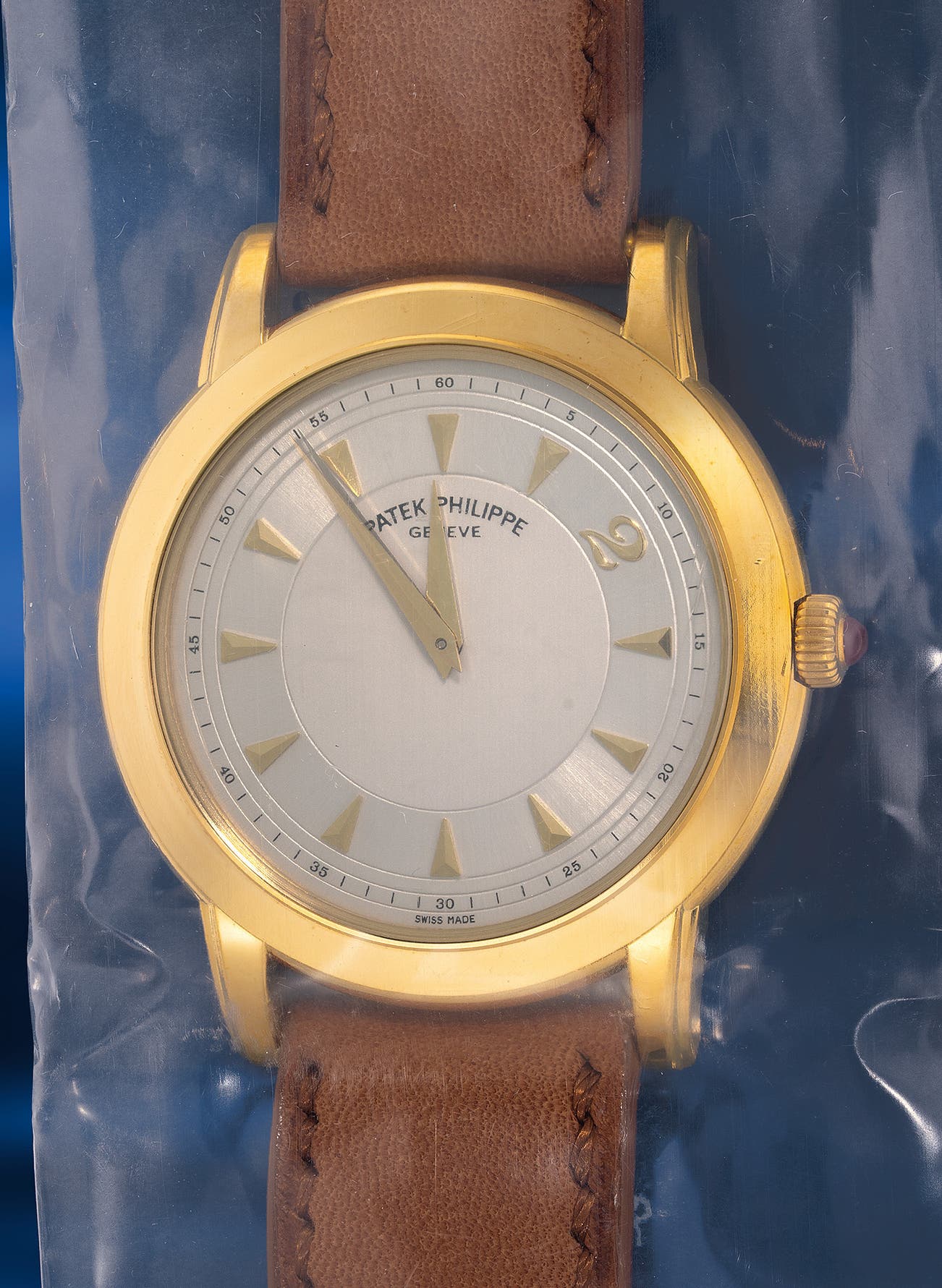 Limited to just 100 pieces in 18K yellow gold, the ref. 5032 Millennium stands out as one of the smallest anniversary editions ever produced by the brand. Crafted by Favure-Perret, its 36mm two-piece case features a screw back and elegant downturned lugs. Produced from 1995 to 2001, it is distinguished by a silvered dial with dagger hour markers, five-minute divisions, and a single applied Breguet numeral “2” to mark the new millennium. Adding a unique touch, the crown is set with a cabochon ruby. Numbered 53 and preserved in single-sealed condition, the present fresh-to-the-market example offers collectors a rare opportunity to acquire a truly special commemorative timepiece.