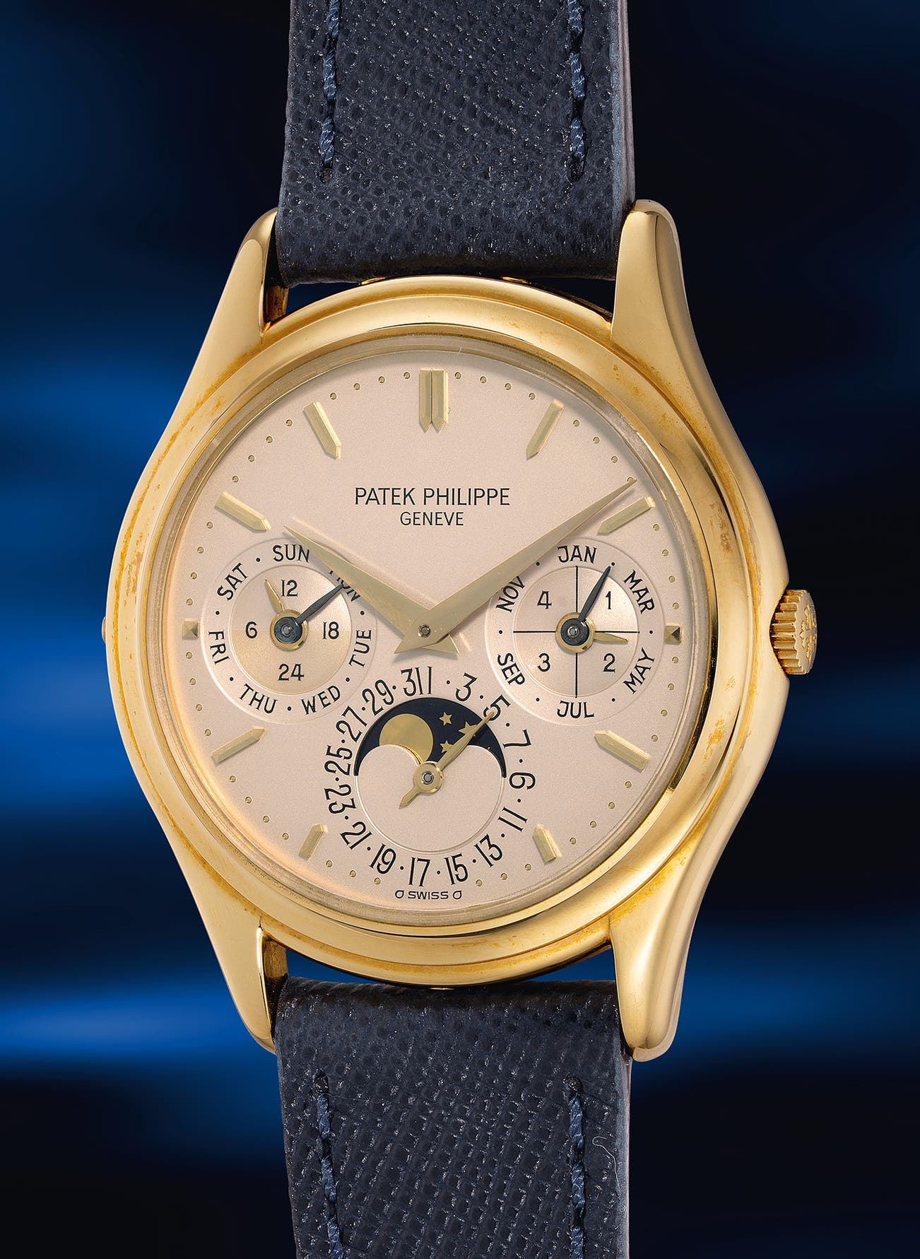 The present fresh-to-the-market, yellow gold example dates to 1989 and is offered in excellent overall condition. It is also worth to note that it is a later second-series example, which can be distinguished by the cross divider on the leap year indicator and the Swiss sigma printed below the outer minute track. It is accompanied by its original accessories and further supported by an Extract from the Archives, confirming its authenticity and provenance.