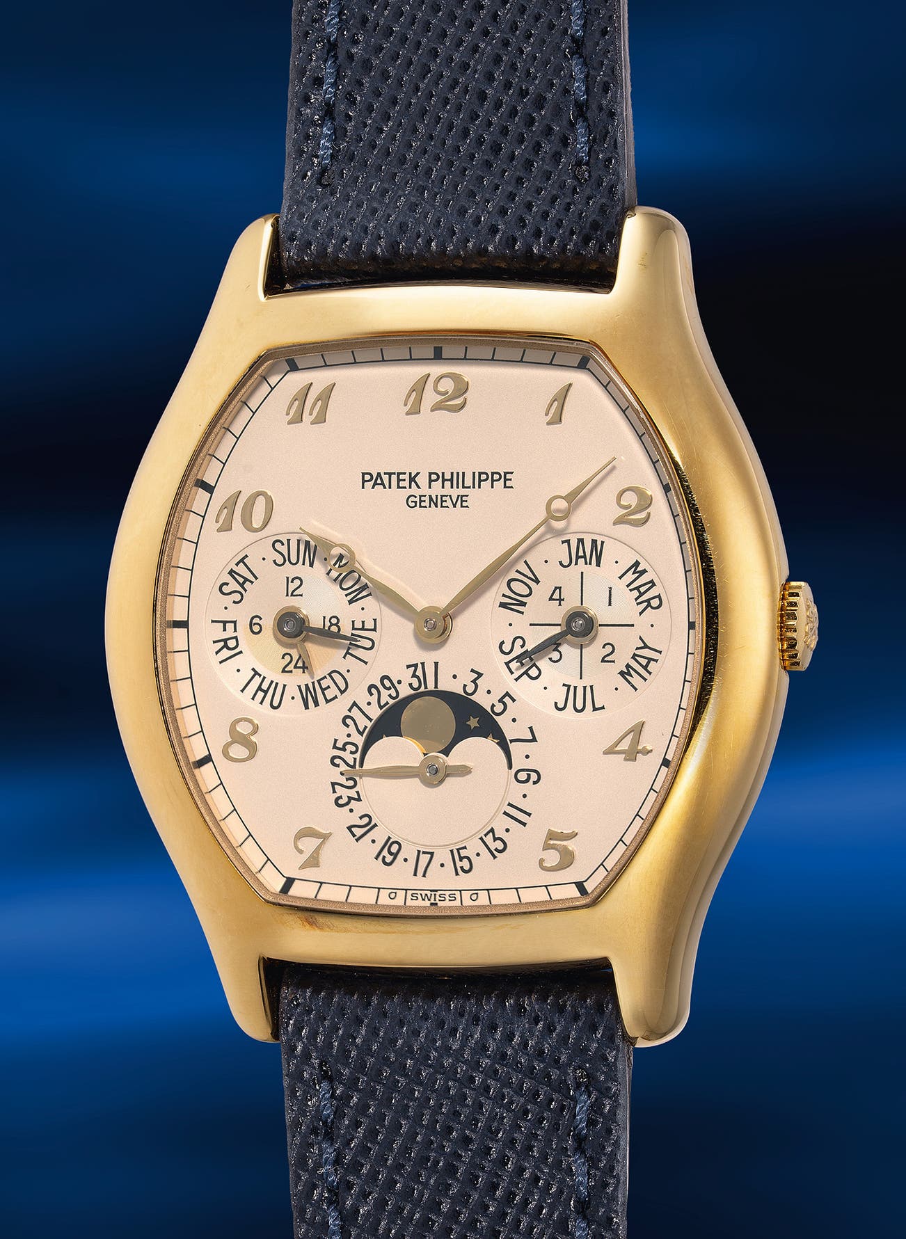 An early and fine yellow gold tonneau-shaped perpetual calendar wristwatch with Breguet numerals, moon phases, 24-hour, leap year indication, setting pin, additional sapphire caseback, and presentation box