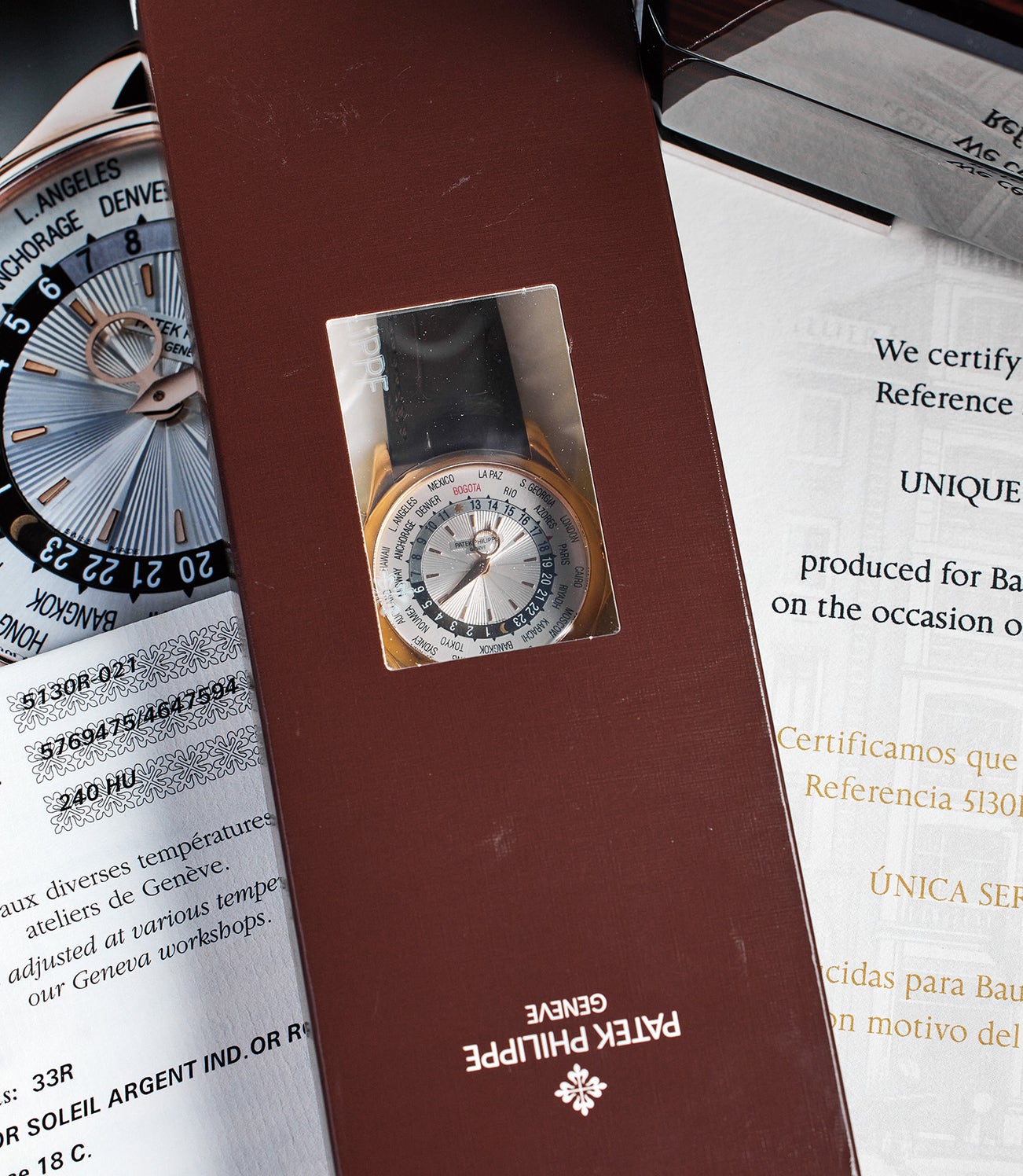 Released in 2006, the Patek Philippe reference 5130 World Time is the second modern iteration of the famous timepiece. Being the successor of the reference 5110, the new model featured essentially the same caliber but in a larger case size at 39.5mm in diameter, compared to the original 37mm option. The World Time was initially developed by Louis Cottier in 1935, who engineered a system of inner rotating discs indicating 24 cities covering all major time zones. Fast forward to modern times, the mechanism remains largely unchanged due to its simple practicality and ease of use. Produced in all four precious metals including yellow gold, pink gold, white gold, and platinum, the model was sold with numerous dial variants including the present -021 model featuring “Bogota” in red, the capital of Colombia.