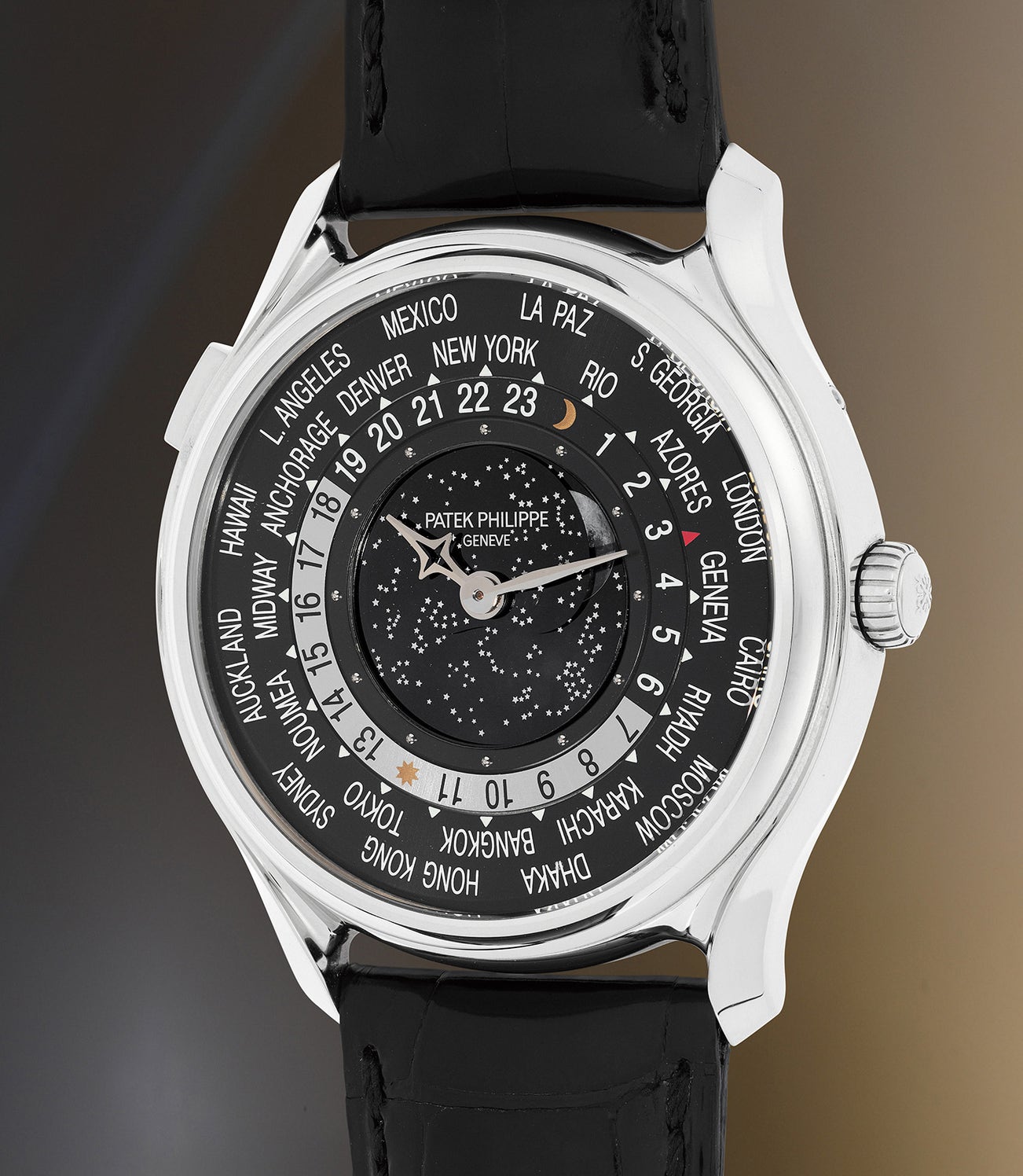 The reference 5575G was no exception. It was the first Patek Philippe timepiece that combined a world time complication with a moon phase following the lunar cycle. The brand engineered an entirely new caliber for this watch (and the corresponding ladies' version, the reference 7175 in rose gold), the caliber 240 HU LU (heures universelle lune), an ultra-thin automatic movement with a 22 karat gold micro rotor. The moon display is immensely realistic, yet retains an elegance against a nocturnal starry sky, with the skyscape made possible by two sophisticated and highly complex moon phase discs rotating according to the actual orbit of the moon.