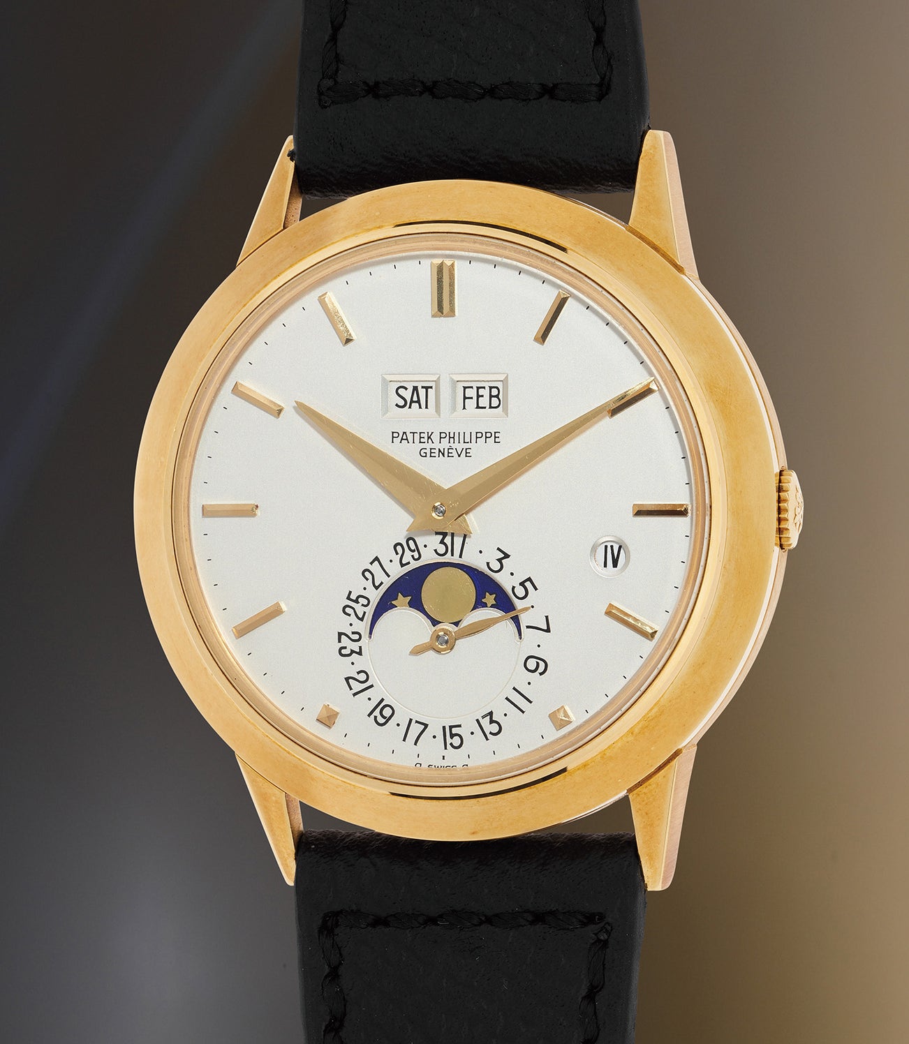 The present watch, manufactured in 1984, is among the very last examples of reference 3450s ever made before the introduction of reference 3940. While the first generation examples were fitted with a "red dot" to indicate the leap year, second generation examples displayed Roman numerals I, II, III and IV, like the present model.