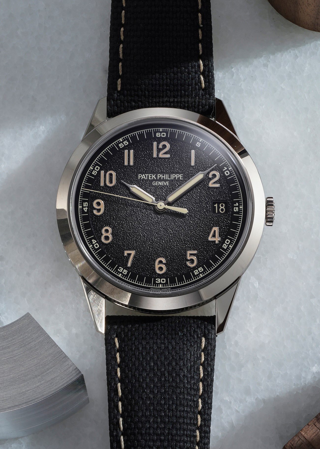 - Turning the watch sideways, on the caseband, one can notice a sublimely finished and quintessentially traditional clous de Paris hobnail decoration, an interesting and well appreciated element. Defined as a "highly contemporary watch with a vintage style", as Patek goes on to describe it, the textured dial features a gradient black minute track that seamlessly contrasts with the beige filled applied Arabic numerals and syringe hands, giving a typical tool watch attire to the timepiece.