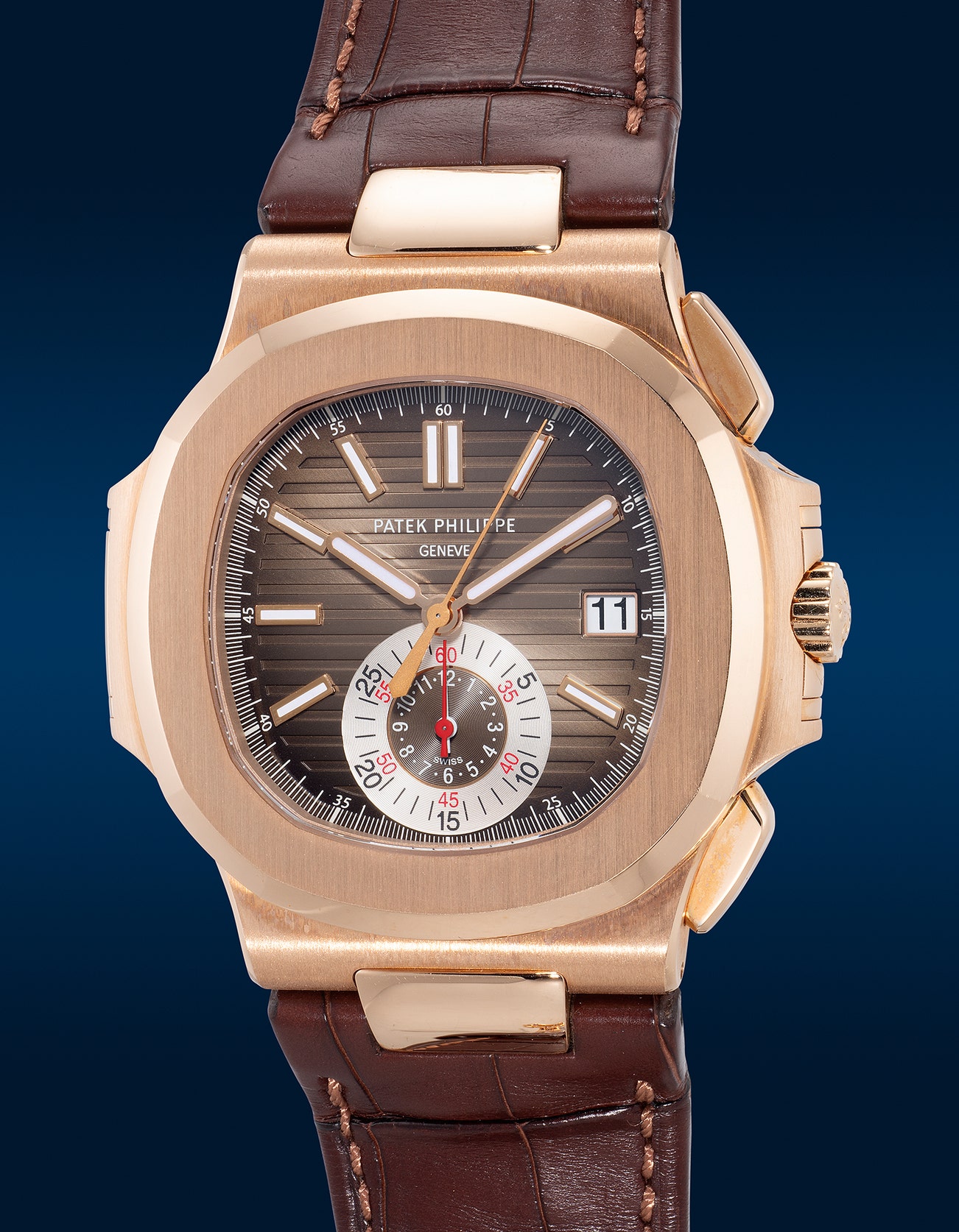 - Adorned with an appealing chocolate brown dial that harmonizes beautifully with the hefty 18K pink gold case, the dial also showcases a silvered all-in-one chronograph register positioned at 6 o'clock. Powering this timepiece is Patek Philippe's first in-house self-winding flyback chronograph caliber CH 28-520 C, further adding to the reference's significance and garnering a growing community of enthusiasts.