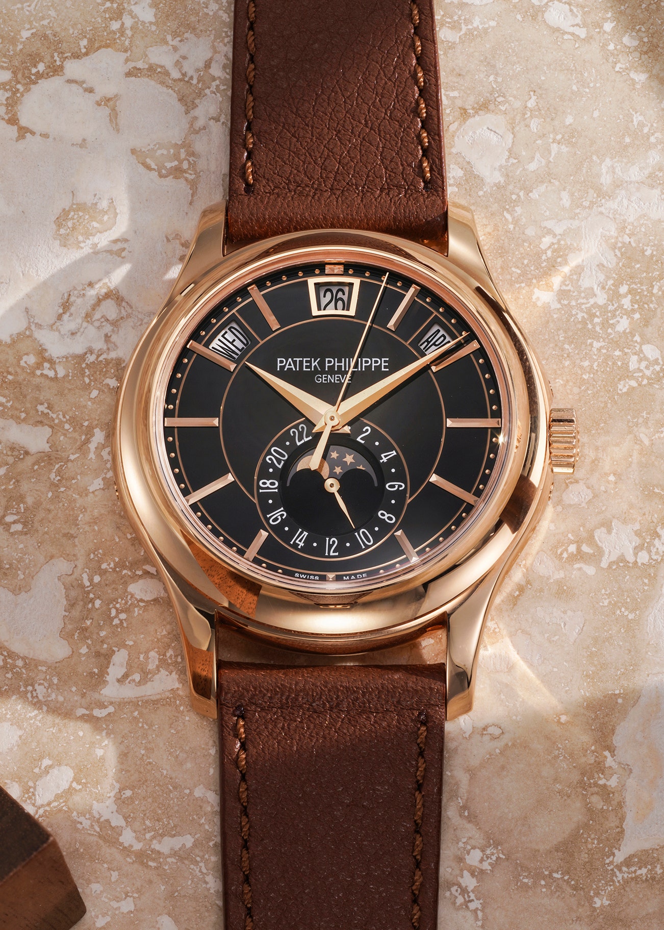 - Released first in white gold, the elegant 40mm diameter case features Patek Philippe’s desired concaved bezel and is the only “non-grand complication” model to feature coveted hollowed lugs.