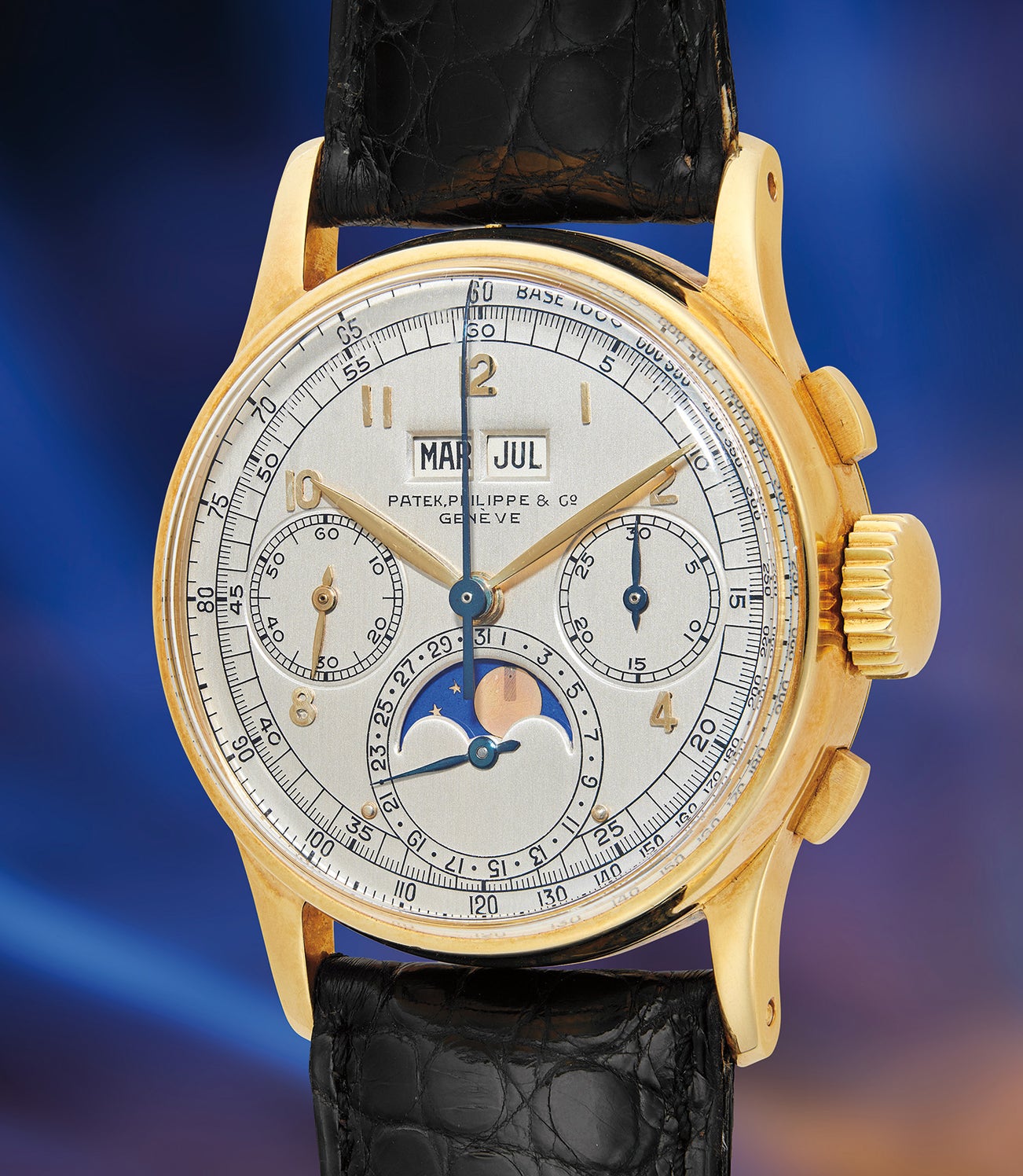 A fresh-to-the-market, important, and well-preserved yellow gold perpetual calendar chronograph wristwatch with French calendar, tachymeter scale and moon phase