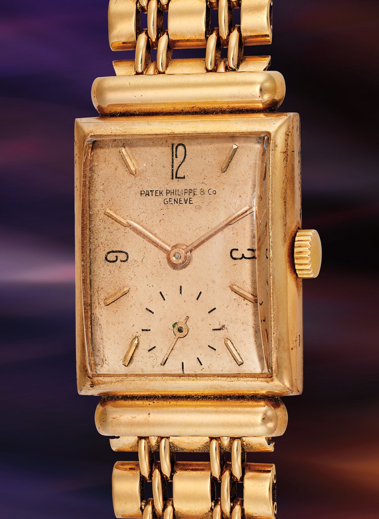 Consigned by the family of the original owner – the same owner of the Patek Philippe reference 1518 offered in the previous lot, the present rectangular shaped pink gold wristwatch is a wonderful example of a Wenger case with hooded lugs, which came to prominence in the early 1930s. Fitted with an 18 karat rose gold bracelet of the period, the watch has a timeless elegance with covered ends, so the bracelet attachments are unseen. It is visually appealing with clean lines reminiscent of early 20th century architecture.