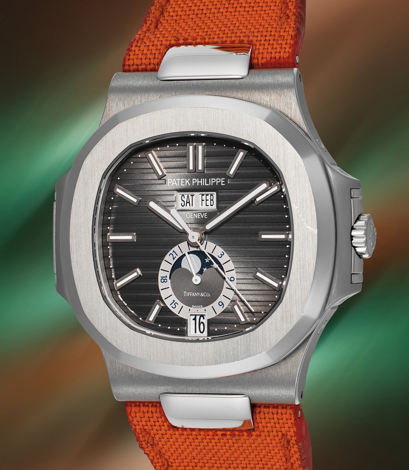 A well-preserved, very rare, and attractive stainless steel annual calendar wristwatch with moon phase, 24-hour display, center seconds, Certificate of Origin, and presentation box, retailed by Tiffany & Co.