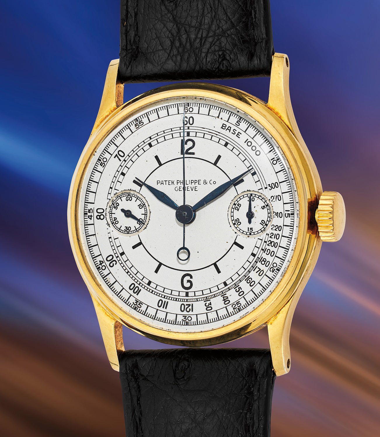 A fan-favorite complication, the standard chronograph was first encased in a wristwatch by Patek Philippe in 1924. The watch featured an officer’s case and displayed totalizers in an unusual configuration at 12 and 6 o’clock. In fact, Patek Philippe had designed and sold a split-seconds chronograph, possibly a prototype, the year before. This watch had an independent seconds hand that could be stopped to measure an interval, then released to synchronize with the continuously running chronograph seconds hand. It also featured a monopusher design, with a single button on the case band controlling the start, stop, and reset functions of the chronograph.