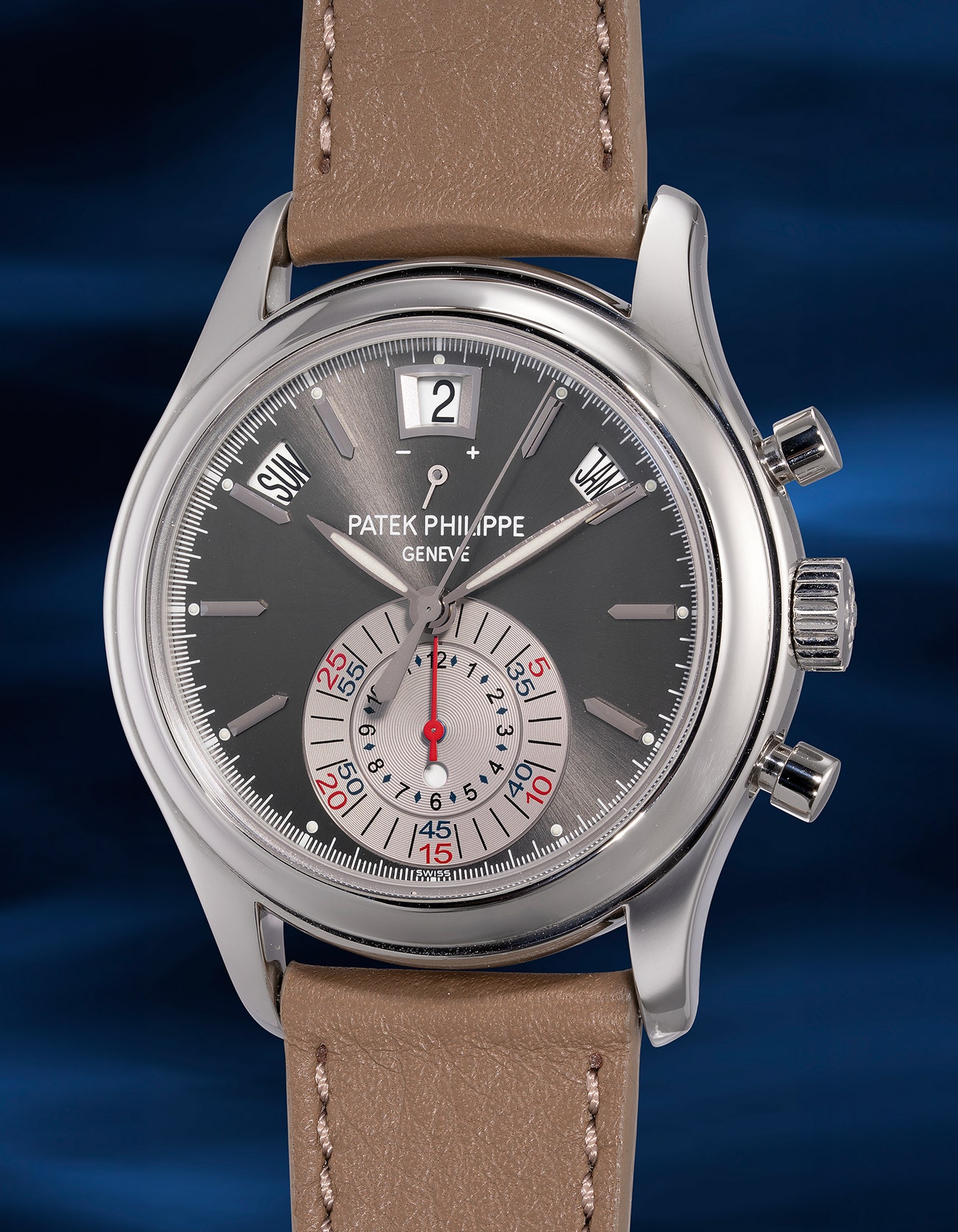 A rare and sporty platinum annual calendar flyback chronograph wristwatch with grey dial, power reserve and day and night indication