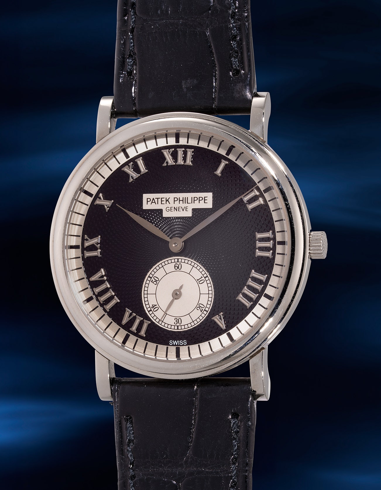 - Boasting a slim profile and a classic aesthetic, the present 5022G example is characterised by an Art Deco dial design. The exquisite black guilloché dial is surrounded by a contrasting silver brushed minute ring, matching the silvered subsidiary dial and the san serif Patek Philippe signature that is set on a silver surface. The dial is further complemented by the applied white gold Roman numerals, imbuing a distinctive decorative style to the timepiece and achieving a perfect match to the simplicity of the Calatrava case with the smooth stepped bezel and straight lugs.