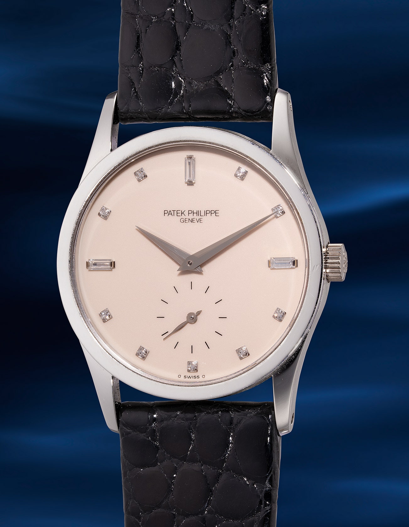 - The reference 3796 comes in many variations across the different case metals, and the present specimen boasts a rare and mesmerizing dial configuration characterised by diamond-set hour markers that are set against a white ivory dial. Baguette-cut diamonds are positioned at the 3, 9, and 12 o’clock, amidst the rest of the brilliant-cut diamonds. This is balanced by the subsidiary second at the 6 o’clock, with simple black markers and a leaf-style hand. The dial is beautifully swept over by the iconic dauphine hands for the hours and minutes, emanating a timeless elegance and understated refinement overall. The lower-case Greek letter sigma beside the "Swiss" signature at the bottom of the dial further indicates that the hands and hour markers of the watch are made of solid gold.