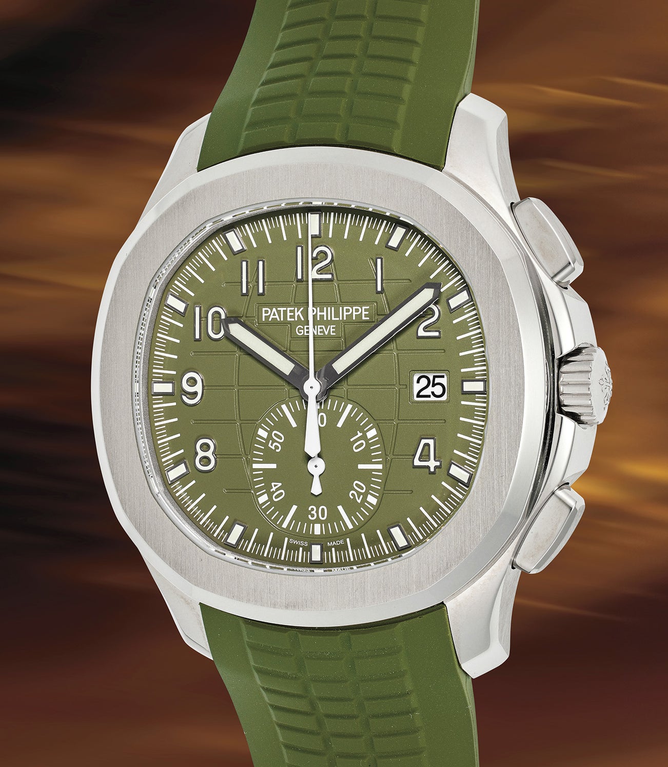 In 2021 Patek Philippe introduced the reference 5968 with a white gold case and military green dial as a more lavish upgrade to the already popular stainless-steel model. The present example is one of only four known to the auction market. It is a luxurious flyback chronograph with a sporty and modern design. The present watch is offered in near new condition and offered complete with its original accessories.
