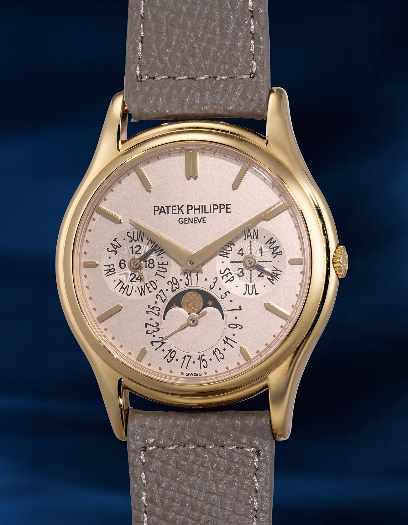 A fine and elegant yellow gold perpetual calendar wristwatch with moon phases, 24-hour and leap year indication