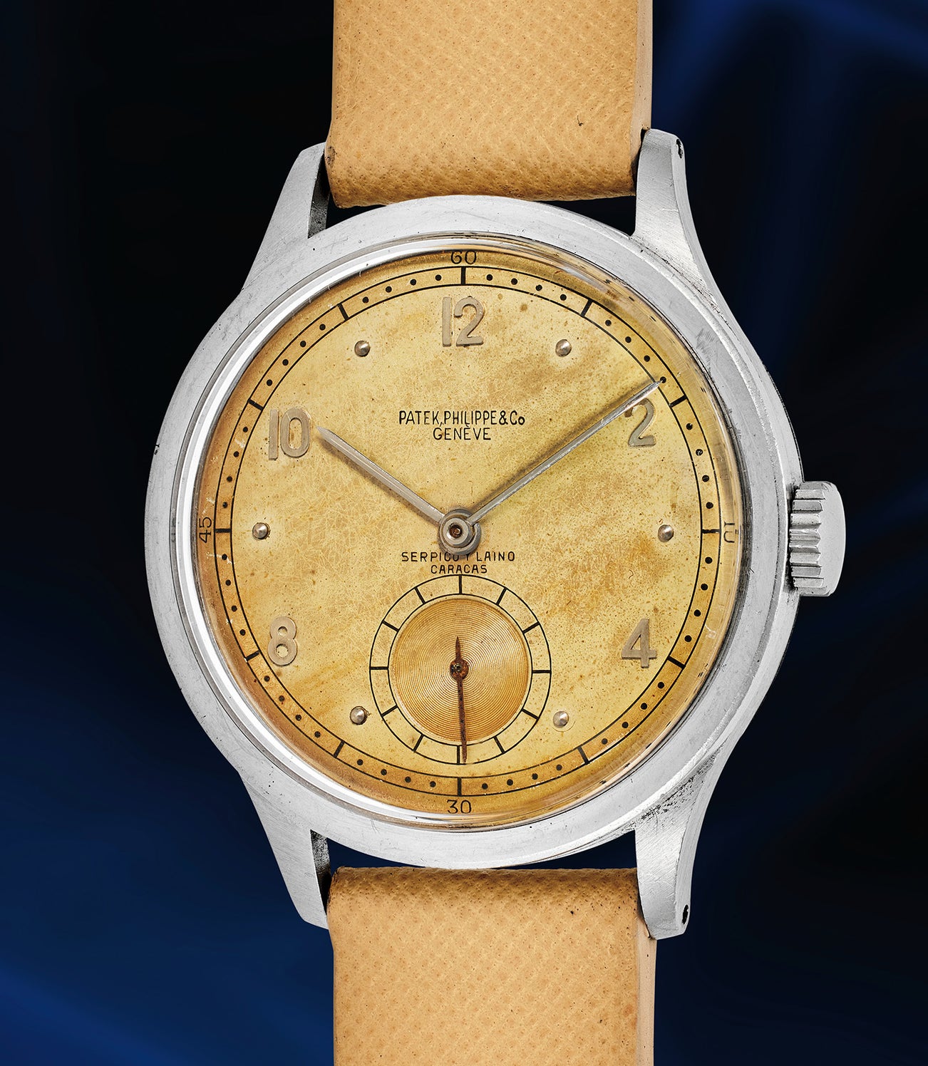 Only three reference 570s signed by the vaunted Venezuelan retailer were previously known to the market, two in 18K pink gold and one in 18K yellow gold. The present example is the first stainless steel 570 signed Serpico y Laino to appear on the market, fitted with a stunningly aged Arabic-dot two-tone dial with railway track remaining completely original and unrestored. An exceptionally dynamic combination, it is ensconced in a likely unpolished case, with a sharply defined bezel and full lugs, giving it unprecedented appeal on the wrist beyond its 36mm case size.