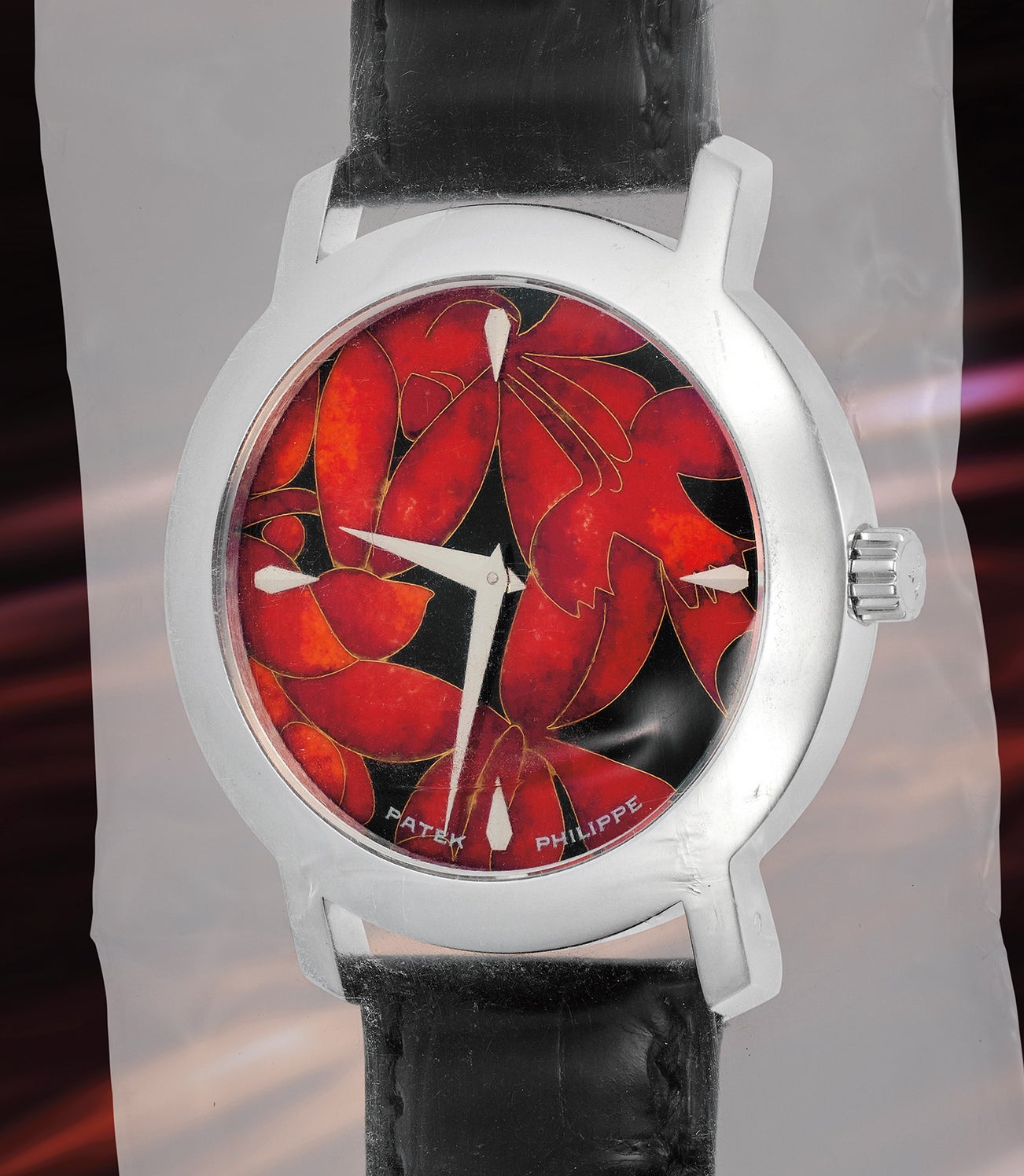 The present watch depicts the flower “Epidendrum Ibaguense”, sometimes called the crucifix orchid or fiery reed orchid. These flowers come in an array of colors, though Patek Philippe chose to use the red variant, and the Latin name comes from the city of Ibagué in Colombia, where the species was first observed and catalogued. Remaining in its factory single seal and offered fresh-to-the-market, this reference 5075 with “red flower” dial is accompanied by its original Certificate of Origin and hang tag.