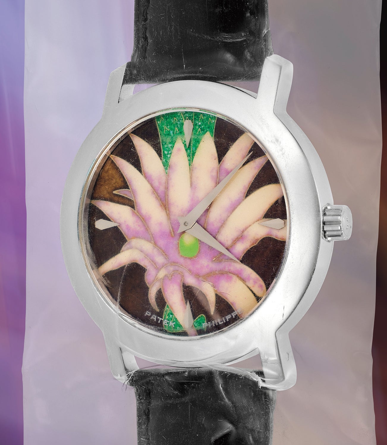 A limited production white gold wristwatch with cloisonné enamel dial depicting “Echinocereus Leucanthus”, Certificate of Origin, and hang tag; factory single-sealed