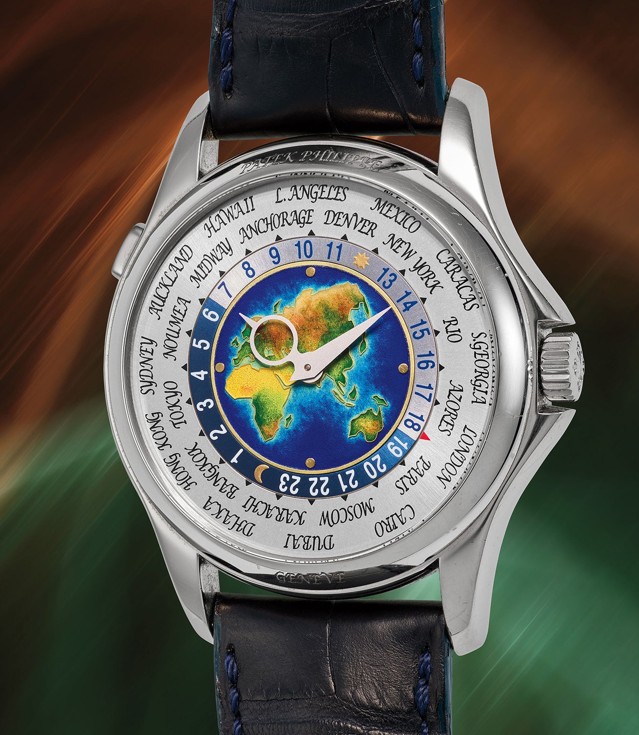 The present white gold reference 5131 is preserved in excellent, and in our opinion unpolished, condition with its full-set of accessories. The lovely enamel dial representing Europe, Africa, Asia and Oceania, all outlined in fine gold, demonstrates the technical mastery and artistic craftmanship of these iconic Patek Philippe world time wristwatches.
